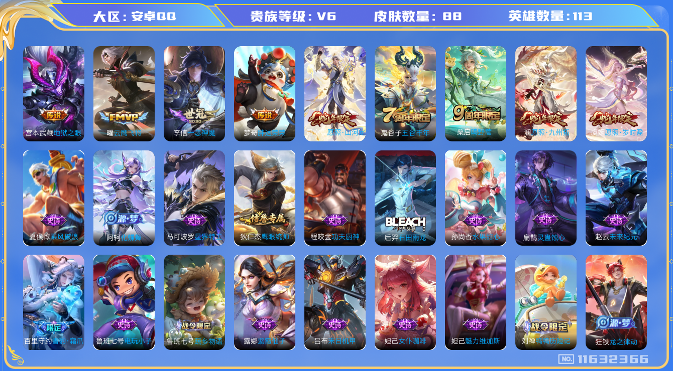[11632366]V6 8传说 113英雄 88皮肤 可修改实名 优质装备:云鹰飞将(小将军),一念神魔,地狱之眼,胖达荣荣 限定皮:愿照·九州拓(澜年限),愿照·岁时盈(虞姬年限),愿照·山河定(司空震年限),鸣野蒿,五谷丰年 史诗皮:鸭鸭历险记-刘禅,化蝶舞,星界特工,灵蛊蚀心,龙之律动,雪豹·霜爪,石田雨龙,蔬乡物语(鲁班七号),紫霞仙子,电玩小子(小书包),末日机甲-吕布,女仆咖啡,水果甜心,功夫厨神,乘风破浪,鹰眼统帅,魅力维加斯,未来纪元-赵云