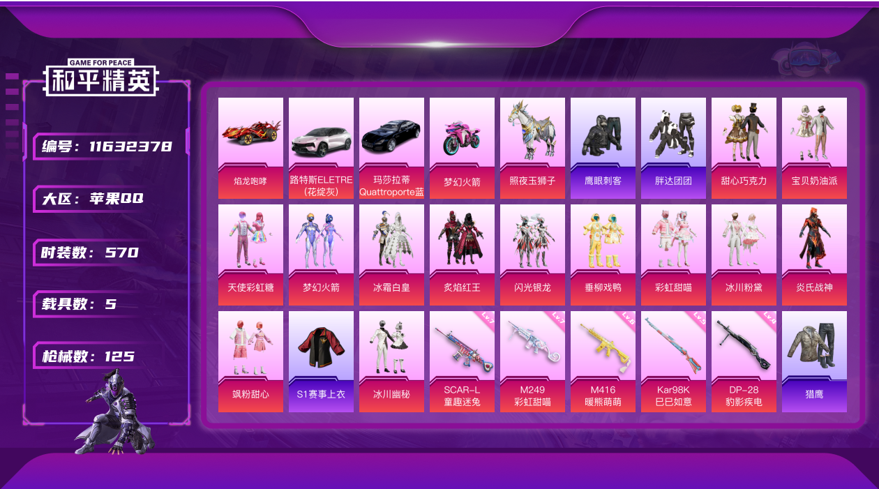[11632378]13粉装 5特效枪 5载具 10印记 可二次 可修改实名 优质装备:甜心巧克力,焰龙咆哮,路特斯ELETRE(花绽灰),玛莎拉蒂Quattroporte(夜幕蓝),梦幻火箭(新101)(新火箭少女101粉色套装),宝贝奶油派,天使彩虹糖,SCAR-L童趣迷兔,炙焰红王,冰霜白皇,M416暖熊萌萌,M249彩虹甜喵(M249-彩虹甜喵),七级M249-彩虹甜喵,七级SCAR-L-童趣迷兔,Kar98K-巳巳如意 热门装扮:闪光银龙,垂柳戏鸭,彩虹甜喵,冰川粉黛,冰川幽秘,飒粉甜心,炎氏战神,S1赛事上衣,胖达团团,鹰眼刺客 载具:双人摩托-梦幻火箭,照夜玉狮子 稀有枪皮:DP-28-豹影疾电 六级特效枪:六级M416-暖熊萌萌 五级特效枪:五级Kar98K-巳巳如意 四级特效枪:四级DP-28-豹影疾电 紫色装扮:田园牧歌,轻风白浪,SS22特训,SS23特训,苍岚星,照水倚天,娇憨猪猪,酸甜橘柚,俏皮奶喵,暖心橘喵,萌趣咩咩,暖心熊熊,SS21特训,SS31特训套装,SS3特训,SS5特训,人气偶像,军械专家,冰川特警,决胜时刻,冷焰舞者,北国孤狼,SS30特训套装,SS33特训套装,SS20特训,微雨春柳,暖风夏荷,猎梦纪元,吉莉礼服,甜心亚梦,虚音幻奏,都市魅力,酒红色名流,野性战魂,长空猛禽,雪山精英,青年教官,迎春赐吉,花园小羊咩,蓝彩潮人,蓝色运动,街头潮人,飞行日记,龙腾端午,魅力单车,鹤鸣,麻辣教官,黄色伏地魔,黄色名流,黄色运动,黎明保卫者,黑色伏地魔,龙的传人,龟仙人,冰河战士,龙魂突击队,极地朋克,极速红龙,棕色飞行服,橘黑制服,沙漠兵团,海滨突袭者,深蓝色名流,幻影武者,坚韧舞者,夜莺强袭者,完美偶像,帅气教官,幻世战舞者,战地名士,战地督导,探宝勇士,湖蓝色名流,绮丽涂鸦,疯狂小兔子,登山爱好者,白色伏地魔,破晓战魂,破蛋小黄鸡,碟中谍A款,游猎者,福星高照,竞技达人朋克,红色运动,甜蜜熊情侣,牛气冲天,灼焰舞者,牛气满满,猛禽,猎鹰,SS29特训,星途旅人,SS28特训,玉兔迎春,巳巳如意,竞技名士,街头风暴,惊鸿侠骨,SS24特训(SS24特训套装),SS25特训,元气发射,金戈铁马,锦衣飞扬,SS27特训,浪漫天命,华灯初上,忠猛周仓,晨曦薄雾,SS26特训,春光漫游,快闪甜心,SS6特训,SS8特训,SS12特训,纯白誓言,暗夜契约