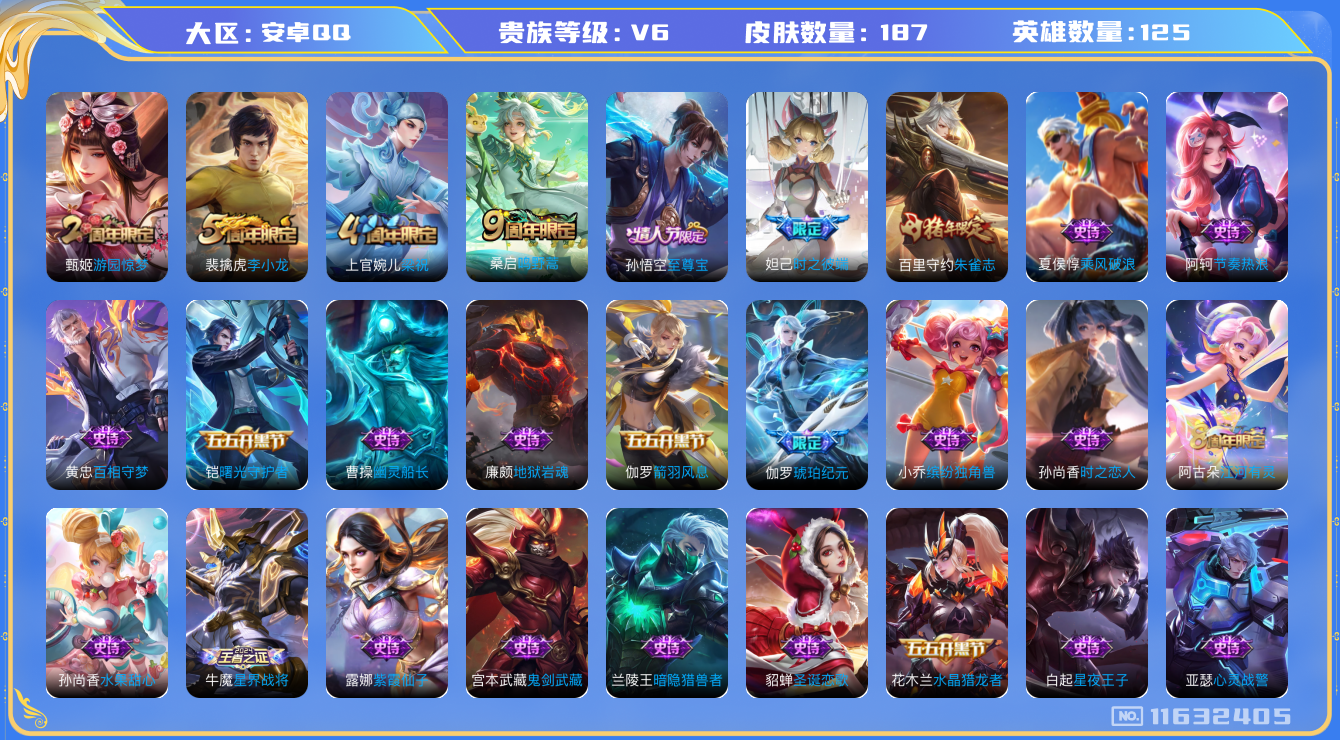 [11632405]V6 1传说 125英雄 187皮肤 可修改实名 珍宝阁皮:胡桃夹子 限定皮:鸣野蒿,至尊宝,时之彼端,游园惊梦,梁祝,李小龙,朱雀志(守约年限) 史诗皮:星界战将,龙之律动,琥珀纪元伽罗,百相守梦-黄忠,紫霞仙子,特工魅影,江河有灵,偶像歌手,时之恋人-孙尚香,节奏热浪,水果甜心,星夜王子,功夫厨神,暗隐猎兽者,幽灵船长,鬼剑武藏,心灵战警,地狱岩魂,纤云弄巧,缤纷独角兽,乘风破浪,水晶猎龙者,曙光守护者,箭羽风息,原初追逐者,圣诞恋歌,鹰眼统帅,魅力维加斯,未来纪元-赵云