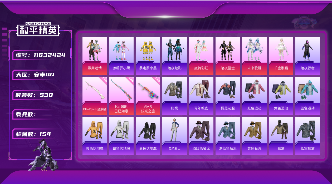 [11632424]5粉装 3特效枪 10印记 可二次 可修改实名 身法装备:暗影哥特(红眼罩) 优质装备:蝶舞迷情,AMR炫光之旅,DP-28-千金淑猫,千金淑猫,Kar98K-巳巳如意 热门装扮:旋转彩虹,暗夜鎏金,未来歌姬,暗夜行者,激萌罗小黑,暴走罗小黑,暗夜魅影 六级特效枪:六级DP-28-千金淑猫 五级特效枪:五级Kar98K-巳巳如意,五级AMR-炫光之旅 紫色装扮:田园牧歌,轻风白浪,和煦暖阳,SS22特训,SS23特训,幻彩翩翩,灵蜜圈圈,妙红点点,香榭午后,白兰地假日,娇憨猪猪,墨染幽兰,酸甜橘柚,暖心橘喵,萌趣咩咩,SS21特训,极光玫瑰,艾菲玫瑰,绚烂繁星,熠彩粉晶,SS31特训套装,SS5特训,人气偶像,冰川特警,冷焰舞者,北国孤狼,SS30特训套装,SS33特训套装,SS20特训,猎梦纪元,SS19特训,软羊咩咩,吉莉礼服,甜心亚梦,虚音幻奏,电音精灵,SS18特训,都市魅力,酒红色名流,野性战心,长空猛禽,雪山精英,霓虹街区,青年教官,蓝彩潮人,蓝色守护者,蓝色运动,街头潮人,跃动心情,飞行日记,魅力单车,鹤鸣,麻辣教官,黄色伏地魔,黄色名流,黄色运动,黎明保卫者,黑色伏地魔,龙的传人,龟仙人,极速红龙,柠萌假日,橘黑制服,沙漠兵团,海岛探路者,深蓝色名流,滨海假日,幻影武者,夏日音浪,完美偶像,帅气教官,幻世战舞者,战地督导,探宝勇士,湖蓝色名流,滨海厨神,绮丽涂鸦,疯狂小兔子,白熊同盟,白色伏地魔,破晓战魂,破蛋小黄鸡,甜蜜告白,空岛之星,空投萌叽,竞技勇士朋克,竞技达人朋克,红色运动,王牌教练,牛气冲天,灰色格斗者,灼焰舞者,炫蓝之夏,热血青春,牛气满满,猛禽,特殊使命,特训学院,狂沙舞者,猎鹰,SS29特训,SS28特训,光矢逐梦,鱼渊荷华,玉兔迎春,燕燕于飞,巳巳如意,都市丽猫,竞技名士,摩登魅猫,暗影哥特(红眼罩),银尘,惊鸿侠骨,神气柴柴,懵萌河马,SS24特训(SS24特训套装),SS25特训,绝对偶像,锦衣飞扬,粉红小猪,SS27特训,浪漫天命,小丑鱼,SS26特训,SS6特训,SS7特训,顽皮玉兔,玲珑飞花,SS8特训,大橘大利,星渊小夜曲,耀粉歌者,蓝冰羽,紫幽梦,SS32特训服(SS32特训套装),青玉碎影,绯格组合,萌黄之夏,恋语绒绒,鲛海歌灵,魅影蝠王,青丘仙客,光之冒险 优质战备:千金淑猫降落伞,幻星舰长飞行器,临安公主降落