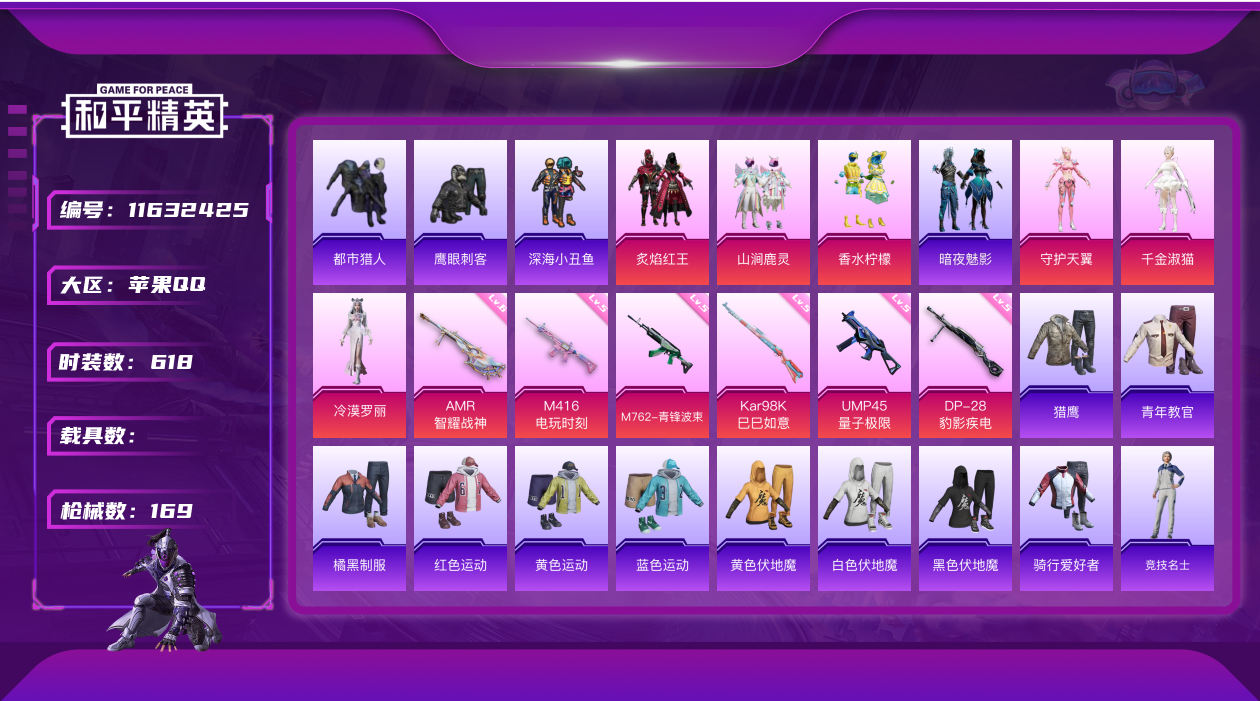 [11632425]6粉装 6特效枪 6印记 可二次 可修改实名 身法装备:都市猎人,暗影哥特(红眼罩) 优质装备:都市猎人 热门装扮:千金淑猫,冷漠罗丽,香水柠檬,炙焰红王,山涧鹿灵,守护天翼,鹰眼刺客,深海小丑鱼,都市猎人,暗夜魅影 稀有枪皮:AMR-智耀战神,Kar98K-巳巳如意,UMP45量子极限,M762-青锋波束,M416电玩时刻 六级特效枪:六级AMR-智耀战神 五级特效枪:五级M762-青锋波束,五级UMP45-量子极限,五级Kar98K-巳巳如意,五级DP-28-豹影疾电,五级M416-电玩时刻 紫色装扮:田园牧歌,轻风白浪,SS22特训,萌趣咩咩,甜心亚梦,虚音幻奏,SS20特训,SS21特训,娇憨猪猪,人气偶像,SS23特训,极速光影,SS15特训,SS13特训,SS14特训,冰爽海盐,浪漫樱花,飞驰魅影,SS18特训,浓情蜜辣,音速流光,极速竞梦,SS19特训,冰川特警,SS16特训,瑞龙福将,团圆交子,SS17特训,蓝色运动,虎虎生威吉莉,街头潮人,跃动心情,蓝彩潮人,都市漫游者,都市魅力,酒红色名流,酷潮明星,蓝色守护者,阳光火鸡,竞技勇士朋克,竞技达人朋克,红色运动,绮丽涂鸦,缤纷果语,耀眼新星,长空猛禽,冰河战士,龙魂突击队,蝶变,龟仙人,无面战甲,青年教官,飞行日记,骑行爱好者,魅力单车,鹤鸣,麻辣教官,黄色伏地魔,黄色名流,黄色运动,黑色伏地魔,福星高照,战地督导,探宝勇士,时尚圣诞,极速红龙,柠萌假日,格斗先锋,橘黑制服,怒火燎原,冷焰舞者,北国孤狼,吉莉礼服,完美偶像,帅气教官,幻世战舞者,幻影武者,甜蜜告白,狂沙舞者,猎鹰,猛禽,王牌教练,甜蜜熊情侣,白熊同盟,白色伏地魔,破晓战魂,破蛋小黄鸡,海岛探路者,深蓝色名流,湖蓝色名流,滨海假日,滨海厨神,牛气满满,灰色格斗者,灼焰舞者,炫蓝之夏,热血青春,牛气冲天,粉日山川,小熊娃娃,雏菊兔兔,萝兰蝴蝶,SS29特训,冰公主,纯真浪花,热情海星,曼妙人鱼,SS28特训,暗影刺翼,湖雨初晴,暗影哥特(红眼罩),玉兔迎春,巳巳如意,海琴烟,星途旅人,竞技名士,都市丽猫,SS25特训,SS24特训(SS24特训套装),幻羽潜行,焰鹰斗篷,幽夜迷踪,SS27特训,萌趣绒叽,浪漫天命,逆风勇士,SS6特训,SS11特训,耀粉歌者,大橘大利,原初圣火,SS9特训,SS8特训,SS10特训,纯白誓言,青玉碎影,