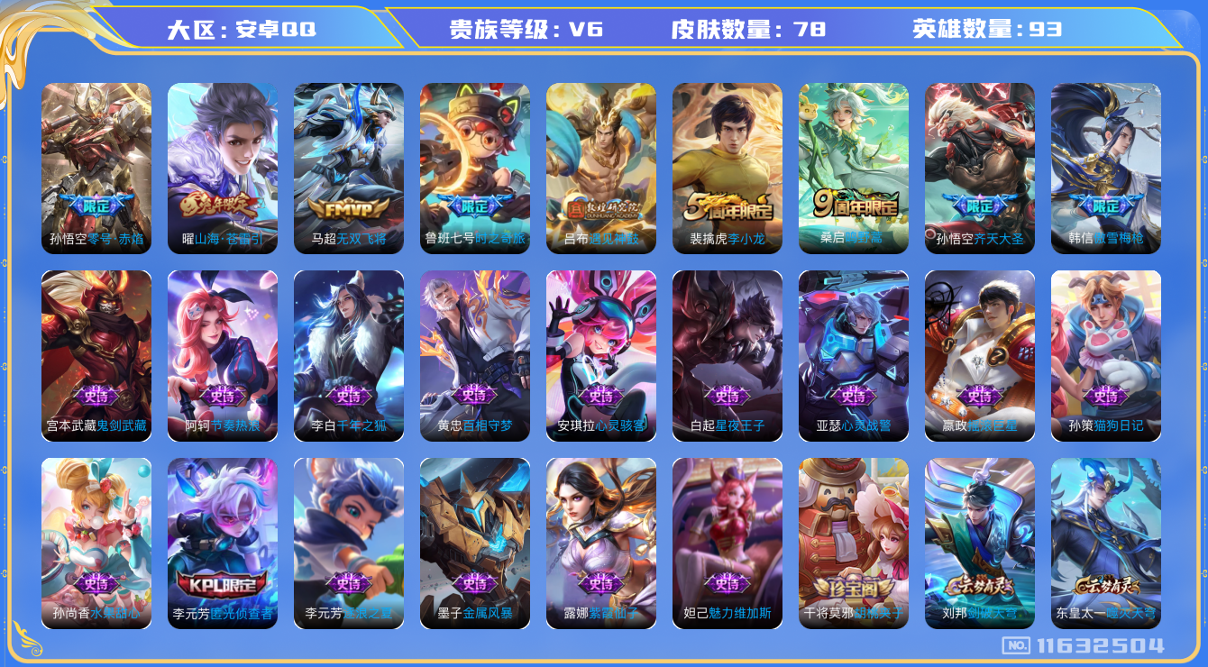 [11632504]V6 7传说 93英雄 78皮肤 可修改实名 优质装备:零号·赤焰,无双飞将,山海·苍雷引(电光曜子),遇见神鼓,鲁班七号-时之奇旅 珍宝阁皮:胡桃夹子 限定皮:鸣野蒿,傲雪梅枪,齐天大圣,李小龙 史诗皮:百相守梦-黄忠,紫霞仙子,千年之狐,匿光侦查者,猫狗日记-孙策,节奏热浪,摇滚巨星,水果甜心,星夜王子,心灵骇客,鬼剑武藏,心灵战警,逐浪之夏,金属风暴,魅力维加斯