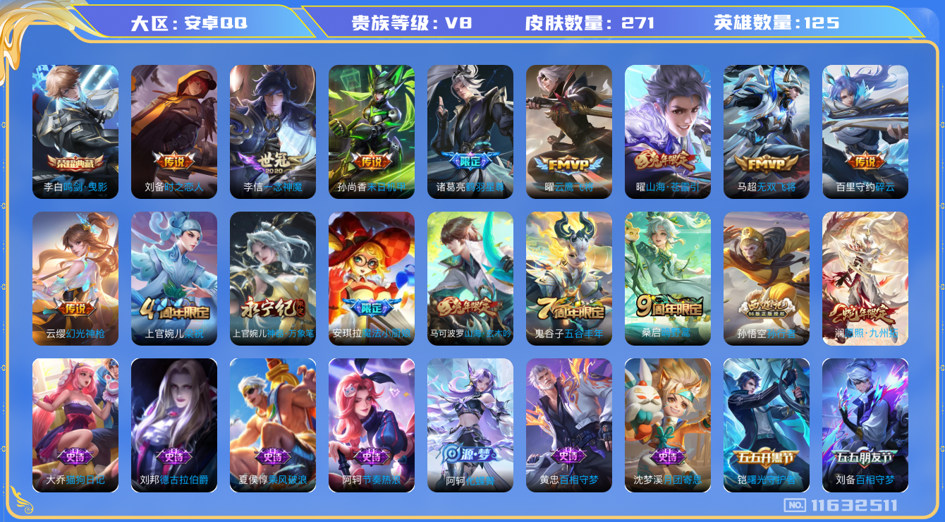 - [11884629]V9 2典藏 19传说 124英雄 275皮肤 可修改实名 优质装备:鸣剑·曳影,星域神启(倪克斯贼亮),云鹰飞将(小将军),炽阳神光,地狱火,仲夏夜之梦(大飞蛾),地狱之眼,胖达荣荣,淬星耀世,挚爱之约,挚爱花嫁,碎云,鹤羽星尊,澜逐花归海 珍宝阁皮:优雅恋人 限定皮:至尊宝,武陵仙君(小桃花),补天,时雨天司(水龙头),神威(电光马子),诗剑行,五谷丰年,青龙志(铠年限),冰锋战神,武圣,梁祝,辉光之辰,真爱至上,大圣娶亲,寅虎·心曲(虎婆),寅虎·赤拳(老虎年限) 史诗皮:星界战将,龙之律动,百相守梦-周瑜,遇见神鹿,紫霞仙子,电玩小子(小书包),白龙吟,黄金分割率,特工魅影,千年之狐,江河有灵,鹤归松栖(赵怀真),魅语,百解令(蒙犽),蒙恬荣光圣徽,无限星赏官,偶像歌手,晚萤,龙骑士(小龙虾),末日机甲-吕布,猫狗日记-孙策,时之恋人-孙尚香,乱世虎臣,节奏热浪,修罗,女仆咖啡,摇滚巨星,水果甜心,天才门将,星夜王子,功夫厨神,德古拉伯爵,暗隐猎兽者,幽灵船长,鬼剑武藏,暗渊魔法,心灵战警,舞动绿茵,地狱岩魂,拒霜思,缤纷独角兽,乘风破浪,逐浪之夏,水晶猎龙者,曙光守护者,箭羽风息,金属风暴,原初追逐者,圣诞狂欢,圣诞恋歌,鹰眼统帅,暗夜贵公子,黎明之约,赏金猎手,无心,未来纪元-赵云