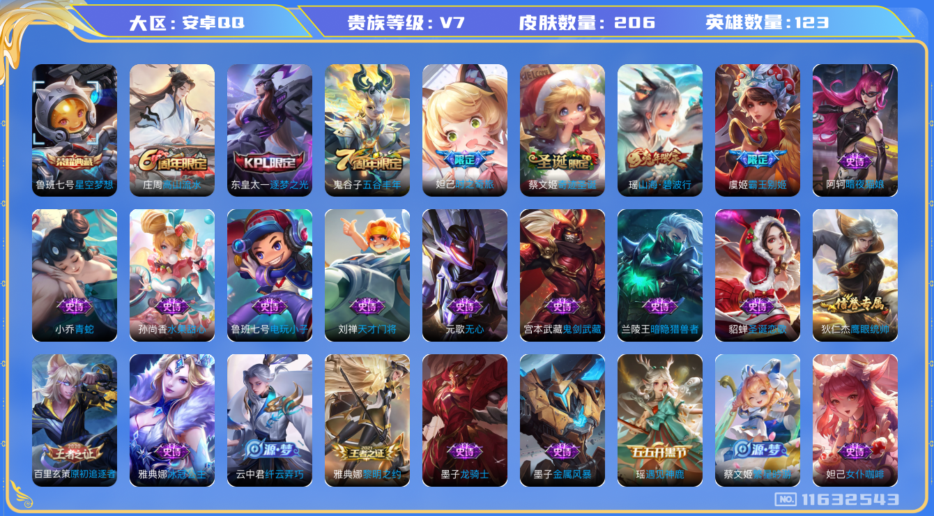 [11632543]V7 1典藏 123英雄 206皮肤 可修改实名 女号 优质装备:星空梦想(太空人) 珍宝阁皮:蔷薇恋人,女武神 限定皮:山海·碧波行(瑶年限),高山流水,五谷丰年,逐梦之光,霸王别姬-虞姬,奇迹圣诞,时之奇旅-妲己 史诗皮:遇见神鹿,电玩小子(小书包),蒙恬荣光圣徽,偶像歌手,龙骑士(小龙虾),暗夜猫娘,冰冠公主,青蛇,女仆咖啡,水果甜心,天才门将,暗隐猎兽者,鬼剑武藏,纤云弄巧,繁星吟游(呼啦呼啦),拒霜思,金属风暴,原初追逐者,圣诞恋歌,鹰眼统帅,黎明之约,无心