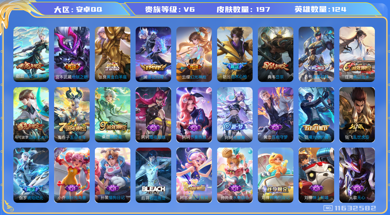 [11632582]V6 6传说 124英雄 197皮肤 可修改实名 优质装备:黄金白羊座,地狱之眼,澜逐花归海 传说皮:乘龙·铭钟鼎(赵云年限),幻光神枪 珍宝阁皮:妄想食味,玩趣恶龙 限定皮:逐霄战戟,鸣野蒿,高山流水,五谷丰年,岱宗(典韦年限),百木心枪,山海·玄木吟(马可年限) 史诗皮:赞萌露比,鸭鸭历险记-刘禅,化蝶舞,龙之律动,石田雨龙,蒙犽顽岩魄,琥珀纪元伽罗,百相守梦-黄忠,特工魅影,千年之狐,江河有灵,百解令(蒙犽),暗夜猫娘,冰冠公主,猫狗日记-孙策,乱世虎臣,节奏热浪,摇滚巨星,水果甜心,绅士熊喵,星夜王子,心灵骇客,暗隐猎兽者,鬼剑武藏,心灵战警,天秀·启明,拒霜思,缤纷独角兽,逐浪之夏,水晶猎龙者,曙光守护者,金属风暴,圣诞恋歌,鹰眼统帅,魅力维加斯,无心,未来纪元-赵云