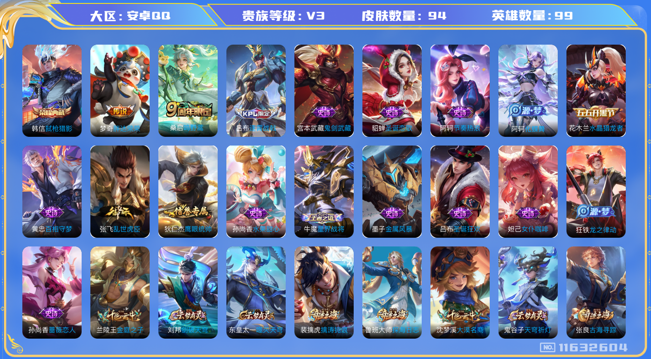 [11632604]V3 1典藏 2传说 99英雄 94皮肤 可修改实名 优质装备:弑枪猎影(韩信典藏),胖达荣荣 珍宝阁皮:蔷薇恋人 限定皮:逐霄战戟,鸣野蒿 史诗皮:化蝶舞,星界战将,龙之律动,百相守梦-黄忠,乱世虎臣,节奏热浪,女仆咖啡,水果甜心,鬼剑武藏,水晶猎龙者,金属风暴,圣诞狂欢,圣诞恋歌,鹰眼统帅