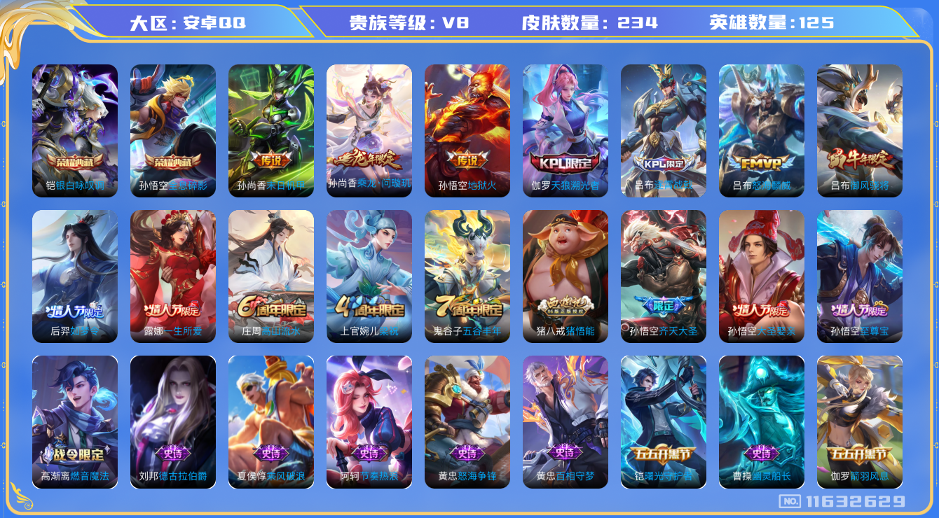 [11632629]V8 2典藏 6传说 125英雄 234皮肤 可修改实名 优质装备:全息碎影(猴子典藏),银白咏叹调(倪克斯侍卫),末日机甲-孙尚香(绿蚂蚱),地狱火 传说皮:乘龙·问璇玑(孙尚香年限) 珍宝阁皮:蔷薇恋人,女武神 限定皮:逐霄战戟,至尊宝,高山流水,齐天大圣,怒海麟威,五谷丰年,梁祝,御风骁将(吕布年限),天狼溯光者,如梦令-后羿,猪悟能,一生所爱,大圣娶亲 史诗皮:怒海争锋,蔬乡物语(鲁班七号),琥珀纪元伽罗,百相守梦-黄忠,电玩小子(小书包),白龙吟,特工魅影,永昼,电玩·爆裂旋风,雪夜绮愿(周瑜),百解令(蒙犽),高渐离燃音魔法,偶像歌手,冰冠公主,末日机甲-吕布,猫狗日记-孙策,节奏热浪,女仆咖啡,摇滚巨星,水果甜心,天才门将,心灵骇客,功夫厨神,德古拉伯爵,幽灵船长,鬼剑武藏,心灵战警,纤云弄巧,拒霜思,缤纷独角兽,乘风破浪,逐浪之夏,曙光守护者,箭羽风息,金属风暴,圣诞狂欢,圣诞恋歌,鹰眼统帅,魅力维加斯,无心,未来纪元-赵云