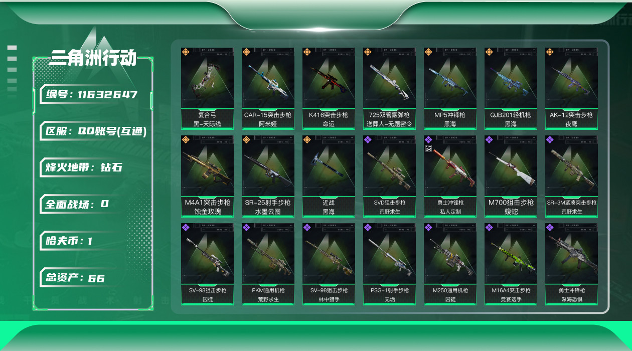 [11632647]可二次 可修改实名 实名:可修改 顶级安全箱(9.17到期) 烽火地带段位:钻石 全面战场段位:上等兵 总资产:66.6 哈夫币:1.310 传说武器皮肤:近战-黑海,K416突击步枪-命运(典藏),SR-25射手步枪-水墨云图,AK-12突击步枪-夜鹰,QJB201轻机枪-黑海,MP5冲锋枪-黑海,复合弓-黑-天际线,CAR-15突击步枪-阿米娅,725双管霰弹枪-送葬人-无题密令,M4A1突击步枪-蚀金玫瑰 史诗武器皮肤:勇士冲锋枪-私人定制(典藏),SR-3M紧凑突击步枪-英雄,M700狙击步枪-蝮蛇,SR-25射手步枪-尖端治疗,PKM通用机枪-荒野求生,AS Val突击步枪-尖端治疗,M700狙击步枪-守夜人,SG552突击步枪-尖端治疗,Ash-12战斗步枪-守夜人,MP5冲锋枪-深海恐惧,SR-3M紧凑突击步枪-荒野求生,勇士冲锋枪-深海恐惧,AKM突击步枪-林中猎手,SVD狙击步枪-暗夜猎手,M16A4突击步枪-竞赛选手,PKM通用机枪-守夜人,SVD狙击步枪-荒野求生,M1014霰弹枪-林中猎手,SV-98狙击步枪-林中猎手,PTR-32突击步枪-英雄,PSG-1射手步枪-无垢,M250通用机枪-囚徒,SV-98狙击步枪-囚徒,QSZ92G-风林火山 干员外观:红狼-蚀金玫瑰