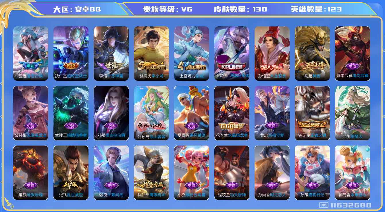 - [11900990]V7 1典藏 2珍品传说 9传说 123英雄 189皮肤 可修改实名 优质装备:拾光映像(瑶典藏),怪盗基德,大耳狗之梦,音你心动-小乔,乞巧织情,山海·琳琅生(小乔年限),小动物乐团,涂山容容 珍宝阁皮:优雅恋人,女武神 限定皮:愿照·福禄聚(蔡文姬年限),愿照·众生和(妲己年限),鸣野蒿,寅虎·展翼(孙膑年限),山海·碧波行(瑶年限),至美·化雀舞,遇见飞天,高山流水,五谷丰年,李小龙,如梦令-嫦娥,时之祈愿-瑶(瑶传限),时之奇旅-妲己 史诗皮:星界战将,石田雨龙,茶境仙,幻珠鲛人,百相守梦-黄忠,织梦人,遇见神鹿,电玩小子(小书包),千年之狐,青蛇,偶像歌手,电玩·兔顽号,电玩·爆裂旋风,暗夜猫娘,猫狗日记-孙策,猫狗日记-大乔,乱世虎臣,女仆咖啡,水果甜心,绅士熊喵,天才门将,星夜王子,心灵骇客,德古拉伯爵,幽灵船长,鬼剑武藏,舞动绿茵,地狱岩魂,纤云弄巧,拒霜思,缤纷独角兽,乘风破浪,月团寄思,水晶猎龙者,金属风暴,原初追逐者,圣诞狂欢,鹰眼统帅,魅力维加斯,赏金猎手,未来纪元-赵云