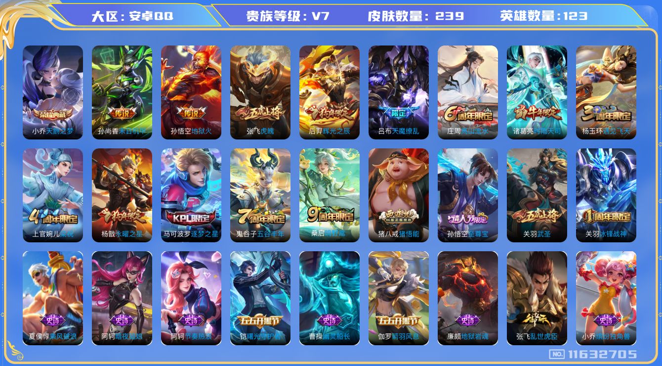 [11632705]V7 1典藏 7传说 123英雄 239皮肤 可修改实名 优质装备:天鹅之梦(小乔典藏),末日机甲-孙尚香(绿蚂蚱),地狱火,涂山容容 珍宝阁皮:蔷薇恋人,玩趣恶龙 限定皮:鸣野蒿,至尊宝,时雨天司(水龙头),遇见飞天,高山流水,五谷丰年,冰锋战神,武圣,梁祝,逐梦之星,虎魄,永曜之星,辉光之辰,猪悟能,天魔缭乱 史诗皮:龙之律动,百相守梦-周瑜,织梦人,电玩小子(小书包),特工魅影,千年之狐,魅语,冰冠公主,偶像歌手,晚萤,电玩·爆裂旋风,暗夜猫娘,猫狗日记-孙策,乱世虎臣,节奏热浪,女仆咖啡,摇滚巨星,水果甜心,绅士熊喵,天才门将,星夜王子,心灵骇客,功夫厨神,暗隐猎兽者,幽灵船长,鬼剑武藏,舞动绿茵,地狱岩魂,纤云弄巧,缤纷独角兽,乘风破浪,逐浪之夏,水晶猎龙者,曙光守护者,箭羽风息,金属风暴,原初追逐者,圣诞狂欢,圣诞恋歌,鹰眼统帅,黎明之约,未来纪元-赵云