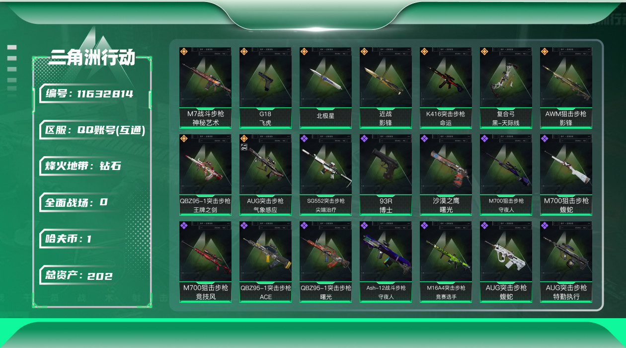 [11632814]可二次 可修改实名 实名:可修改 烽火地带段位:钻石 全面战场段位:军士长 顶级安全箱(3×3)9.15号到期 总资产:202.2 哈夫币:1.423 传说武器皮肤:近战-影锋,近战-北极星,QBZ95-1突击步枪-王牌之剑(典藏),K416突击步枪-命运(典藏),AUG突击步枪-气象感应(典藏),AWM狙击步枪-影锋,复合弓-黑-天际线,G18-飞虎,M7战斗步枪-神秘艺术 史诗武器皮肤:QBZ95-1突击步枪-ACE,AUG突击步枪-特勤执行,AUG突击步枪-蝮蛇,M700狙击步枪-蝮蛇,M700狙击步枪-守夜人,SG552突击步枪-尖端治疗,Ash-12战斗步枪-守夜人,M16A4突击步枪-竞赛选手,QBZ95-1突击步枪-曙光,沙漠之鹰-曙光,M700狙击步枪-竞技风,93R-博士 干员外观:红狼-蚀金玫瑰,骇爪-水墨云图,威龙-飞虎,露娜-黑·天际线