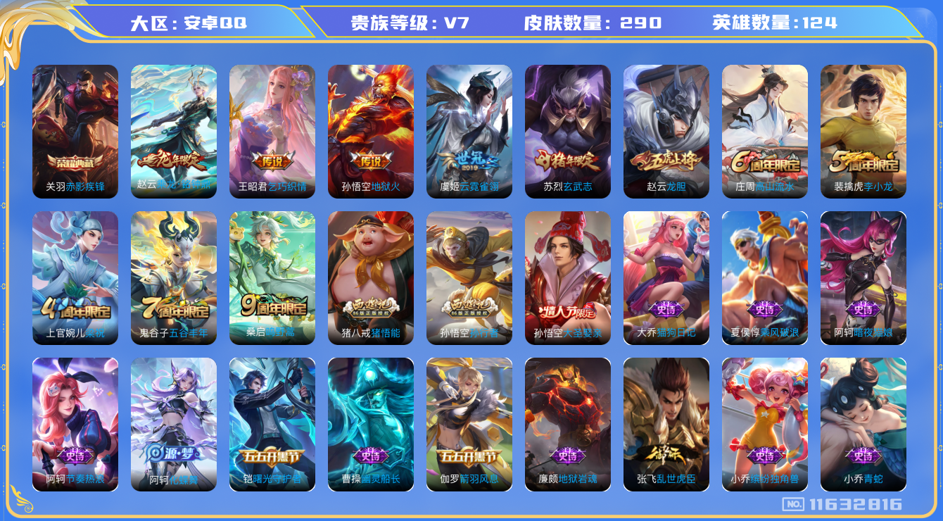 [11632816]V7 1典藏 5传说 124英雄 290皮肤 可修改实名 优质装备:赤影疾锋,云霓雀翎,地狱火,乞巧织情 传说皮:乘龙·铭钟鼎(赵云年限) 珍宝阁皮:妄想食味,蔷薇恋人,女武神 限定皮:鸣野蒿,高山流水,五谷丰年,梁祝,龙胆,李小龙,玄武志(苏烈年限),孙行者,猪悟能,大圣娶亲 史诗皮:化蝶舞,星界战将,石田雨龙,紫霞仙子,苍穹之光,黄金分割率,特工魅影,千年之狐,永昼,百解令(蒙犽),蒙恬荣光圣徽,无限星赏官,冰冠公主,青蛇,电玩·爆裂旋风,暗夜猫娘,龙骑士(小龙虾),末日机甲-吕布,猫狗日记-孙策,猫狗日记-大乔,乱世虎臣,节奏热浪,修罗,女仆咖啡,摇滚巨星,水果甜心,绅士熊喵,星夜王子,心灵骇客,功夫厨神,暗隐猎兽者,幽灵船长,鬼剑武藏,心灵战警,舞动绿茵,地狱岩魂,诗语江南,纤云弄巧,繁星吟游(呼啦呼啦),拒霜思,缤纷独角兽,乘风破浪,逐浪之夏,水晶猎龙者,曙光守护者,箭羽风息,金属风暴,原初追逐者,圣诞狂欢,圣诞恋歌,鹰眼统帅,魅力维加斯,黎明之约,无心,未来纪元-赵云