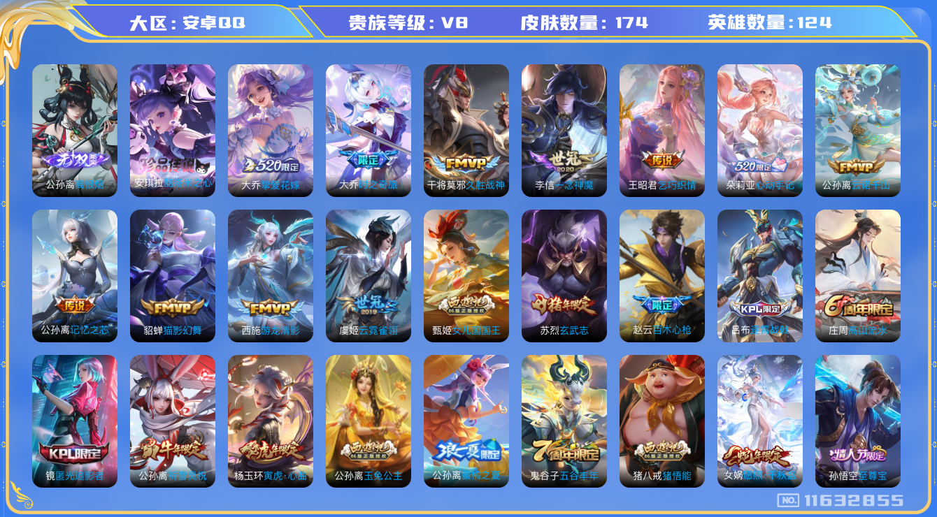 - PX_2052213-4 安卓QQ/ 200皮肤/ 125英雄 贵族7级 【1 珍品传说】怪盗基德 马可波罗, 【1 典藏皮肤】拾光映像 瑶, 【15 传说皮肤】武圣 关羽,逐花归海 澜,无双飞将 马超,零号·赤焰 孙悟空,齐天大圣 孙悟空,时雨天司 诸葛亮,霜月吟 露娜,久胜战神 干将莫邪,末日机甲 孙尚香,一念神魔 李信,战鼓燎原 典韦,超时空战士 狄仁杰,愿照·岁时盈 虞姬,鸣野蒿 桑启,云