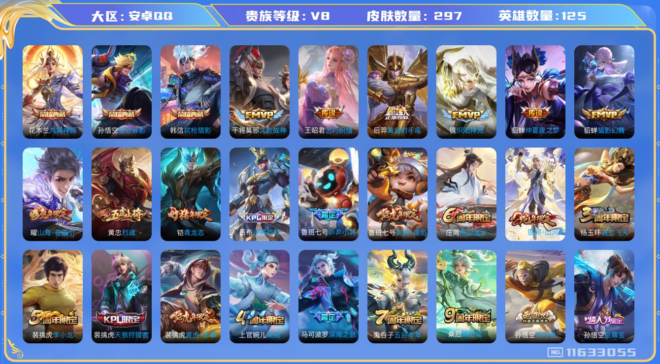 [11633055]V8 3典藏 13传说 125英雄 297皮肤 可修改实名 优质装备:全息碎影(猴子典藏),九霄神辉(木兰典藏),弑枪猎影(韩信典藏),黄金射手座,猫影幻舞,久胜战神,炽阳神光,仲夏夜之梦(大飞蛾),乞巧织情,山海·苍雷引(电光曜子),涂山容容 珍宝阁皮:蔷薇恋人,女武神,玩趣恶龙 限定皮:愿照·山河定(司空震年限),逐霄战戟,鸣野蒿,至尊宝,傲雪梅枪,遇见飞天,高山流水,五谷丰年,青龙志(铠年限),梁祝,天狼狩猎者,烈魂,李小龙,孙行者,乒乒小将,寅虎·瑞焰(虎皮蛋子),寅虎·赤拳(老虎年限),深海之息(深海大菠萝) 史诗皮:糖绘人间,化蝶舞,灵蛊蚀心,星界战将,茶境仙,怒海争锋,蔬乡物语(鲁班七号),紫霞仙子,苍穹之光,黄金分割率,特工魅影,千年之狐,江河有灵,浮梦罗烟,魅语,百解令(蒙犽),蒙恬荣光圣徽,偶像歌手,晚萤,电玩·爆裂旋风,末日机甲-吕布,猫狗日记-孙策,猫狗日记-大乔,乱世虎臣,节奏热浪,女仆咖啡,摇滚巨星,水果甜心,天才门将,星夜王子,心灵骇客,时之奇旅-安琪拉,功夫厨神,德古拉伯爵,暗隐猎兽者,幽灵船长,鬼剑武藏,心灵战警,乐园奇幻夜,舞动绿茵,地狱岩魂,纤云弄巧,缤纷独角兽,乘风破浪,逐浪之夏,水晶猎龙者,曙光守护者,箭羽风息,金属风暴,原初追逐者,圣诞狂欢,圣诞恋歌,鹰眼统帅,暗夜贵公子,魅力维加斯,赏金猎手,无心,未来纪元-赵云,玫瑰异探