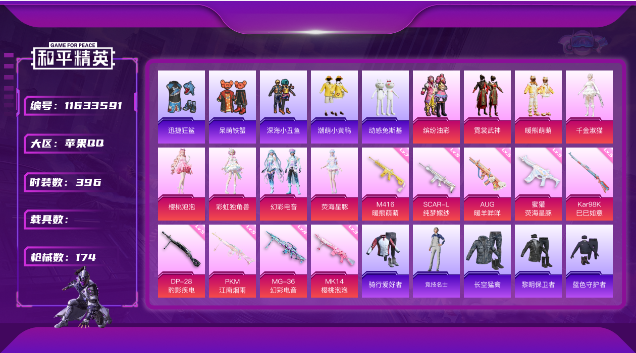 - PX_2096655- 苹果微信-18王牌印记-有战神框-13粉装-10特效枪-2载具-78395热力值-178套装-231枪皮-3卓越印记-2传奇印记 【13粉装】,雪国幻梦,初号机 觉醒Ver.,缤纷油彩,童趣迷兔,怪诞乔克,智耀战神,傲傲奶龙,复仇流浪者,智能音符,莲影清波,冰霜白皇,炙焰红王,蜜桃特工 【10特效枪】AKM-炫紫旋律-7级 SCAR-L-金蛇镇世-3级 M416-暖熊萌萌-