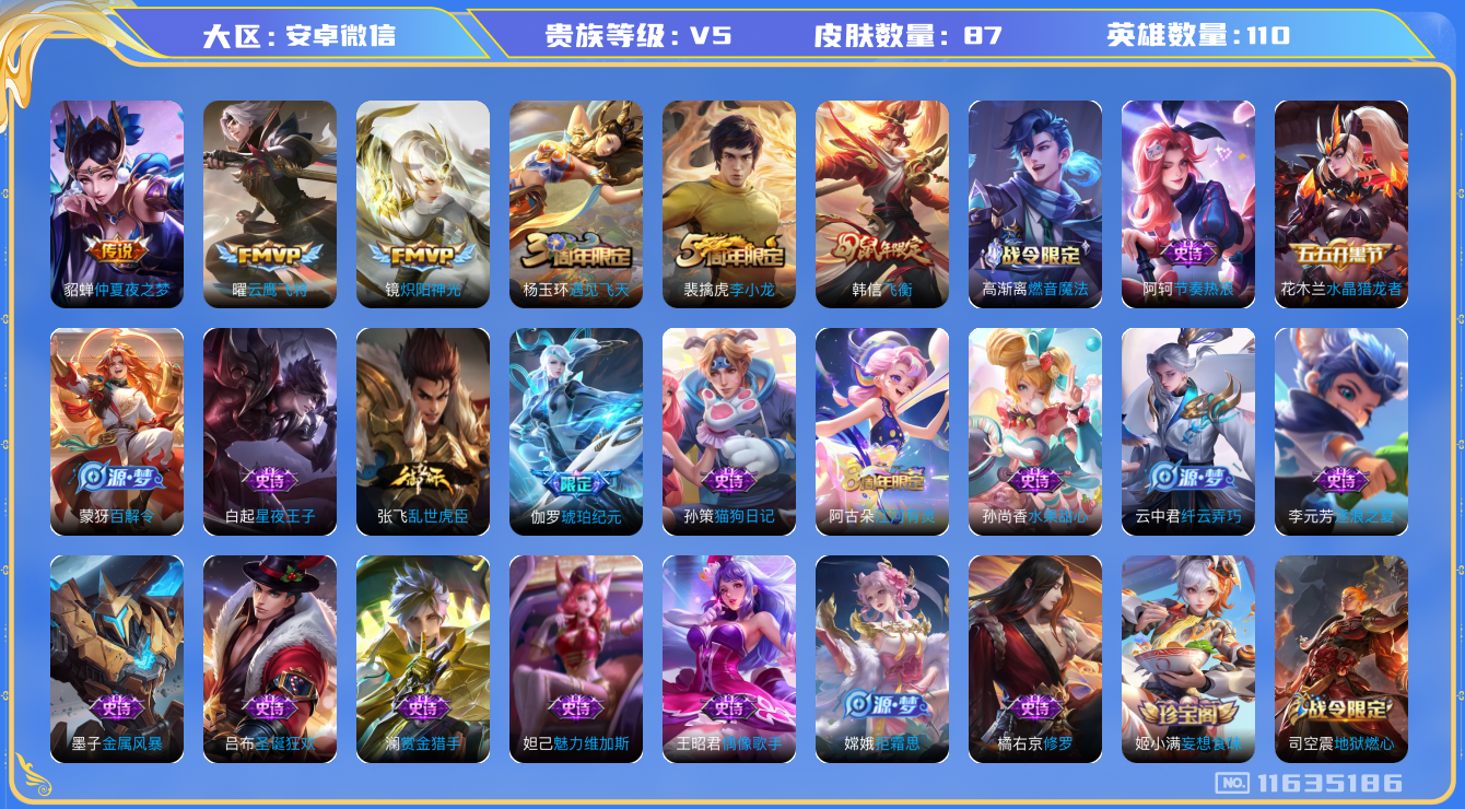 [11635186]V5 3传说 110英雄 87皮肤 可修改实名 安全保护中 优质装备:云鹰飞将(小将军),炽阳神光,仲夏夜之梦(大飞蛾) 珍宝阁皮:妄想食味 限定皮:飞衡(韩信年限),遇见飞天,李小龙 史诗皮:琥珀纪元伽罗,江河有灵,百解令(蒙犽),高渐离燃音魔法,偶像歌手,猫狗日记-孙策,乱世虎臣,节奏热浪,修罗,水果甜心,星夜王子,纤云弄巧,拒霜思,逐浪之夏,水晶猎龙者,金属风暴,圣诞狂欢,魅力维加斯,赏金猎手