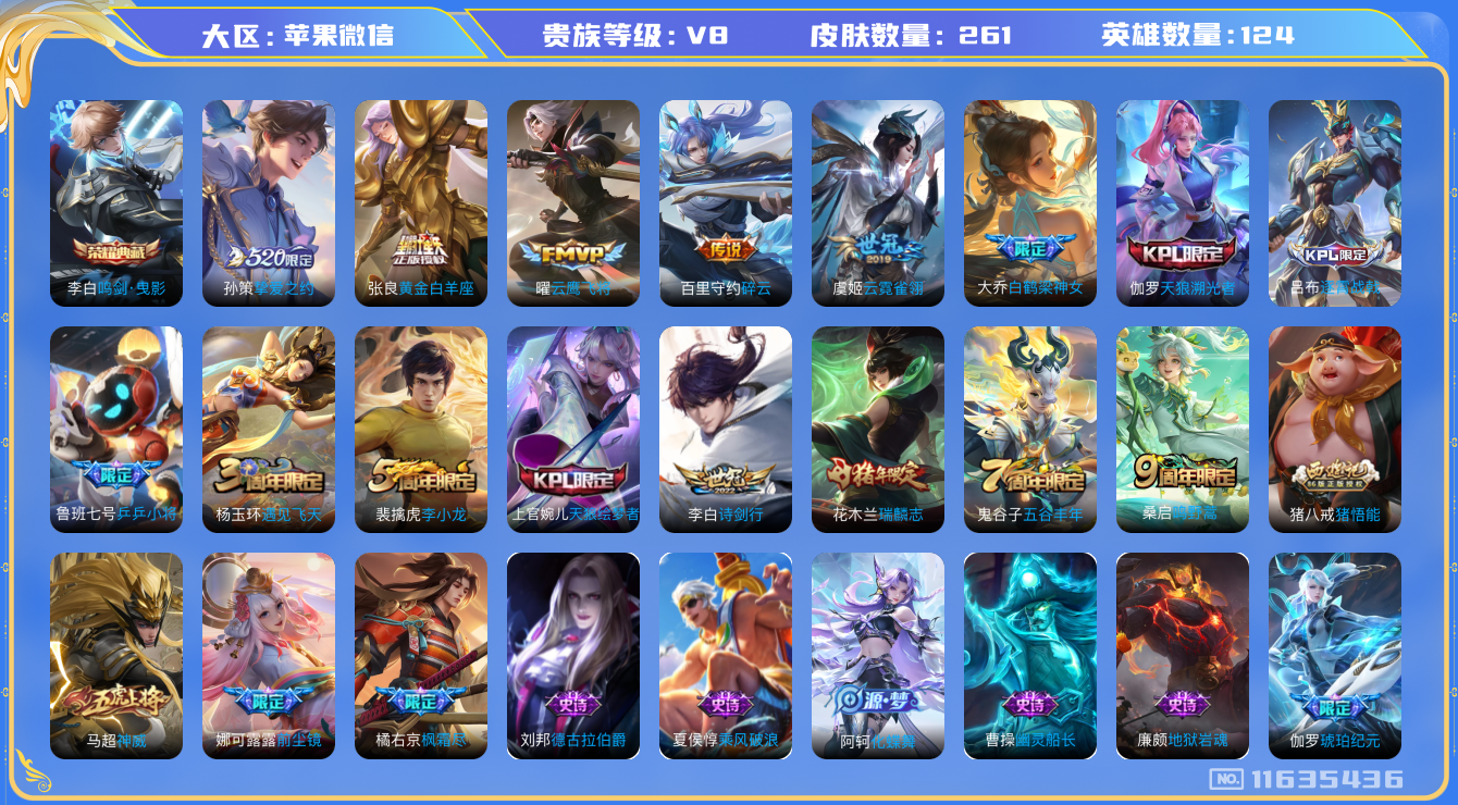[11635436]V8 1典藏 10传说 124英雄 261皮肤 可修改实名 安全保护中 优质装备:鸣剑·曳影,云鹰飞将(小将军),黄金白羊座,云霓雀翎,挚爱之约,碎云 珍宝阁皮:妄想食味,蔷薇恋人 限定皮:逐霄战戟,鸣野蒿,前尘镜,白鹤梁神女,神威(电光马子),瑞麟志(木兰年限),遇见飞天,诗剑行,五谷丰年,天狼溯光者,天狼绘梦者,李小龙,猪悟能,乒乒小将,枫霜尽 史诗皮:化蝶舞,星界战将,琥珀纪元伽罗,紫霞仙子,黄金分割率,千年之狐,江河有灵,百解令(蒙犽),蒙恬荣光圣徽,无限星赏官,冰冠公主,偶像歌手,末日机甲-吕布,猫狗日记-孙策,时之恋人-孙尚香,修罗,女仆咖啡,水果甜心,天才门将,心灵骇客,功夫厨神,德古拉伯爵,暗隐猎兽者,幽灵船长,鬼剑武藏,舞动绿茵,地狱岩魂,纤云弄巧,繁星吟游(呼啦呼啦),拒霜思,缤纷独角兽,乘风破浪,水晶猎龙者,金属风暴,原初追逐者,圣诞狂欢,圣诞恋歌,鹰眼统帅,黎明之约,无心,未来纪元-赵云