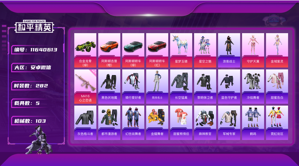 - PX_2103280- 苹果微信-8王牌印记-16粉装-16特效枪-1载具-62971热力值-104套装-160枪皮-1卓越印记-0传奇印记 【16粉装】,梦幻火箭,宝贝奶油派,放客神游,灵感创作师,花间之火,复仇流浪者,猩猩队长,岚岚物语,赤焰黑爵,紫电风暴,炙焰红王,彩虹鹿灵,山涧鹿灵,暗夜鎏金,音爆索尼克,未来战士 【16特效枪】AKM-梦之光华-5级 AKM-百合蜜语-1级 SCAR-L-