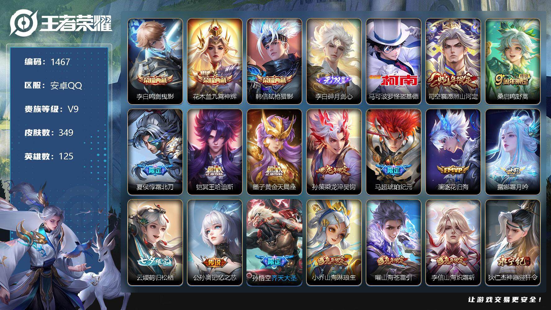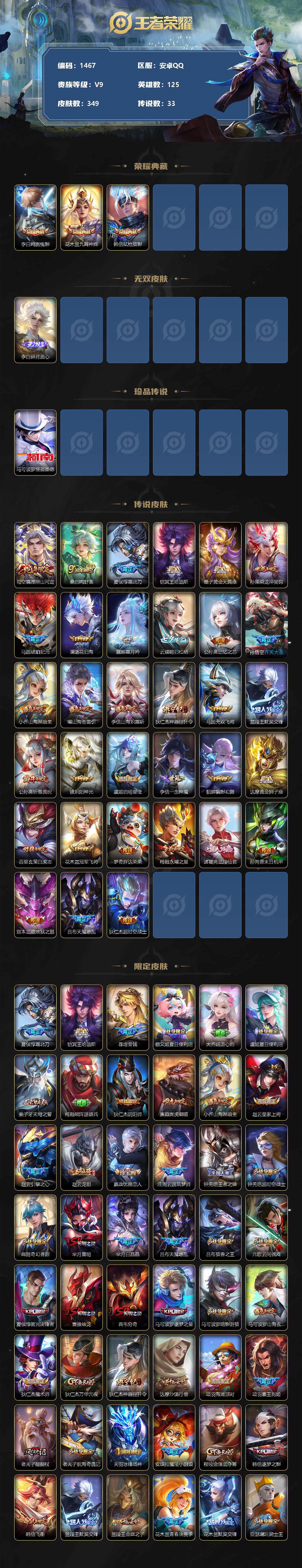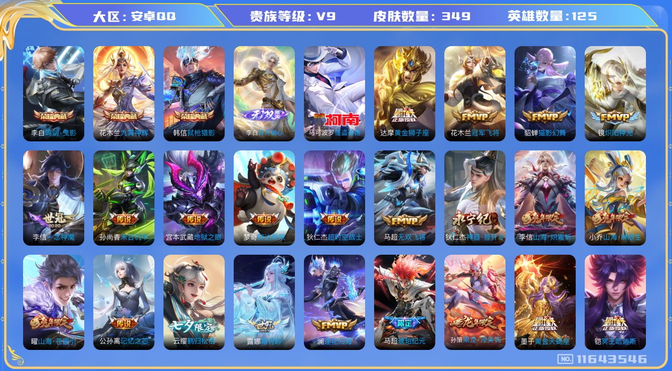 [11643546]【商品标题】:安卓Q-V5-尊贵铂金II段位-125英雄-349皮肤-3典藏-0珍品无双-1无双-1珍品传说-33传说-110史诗
