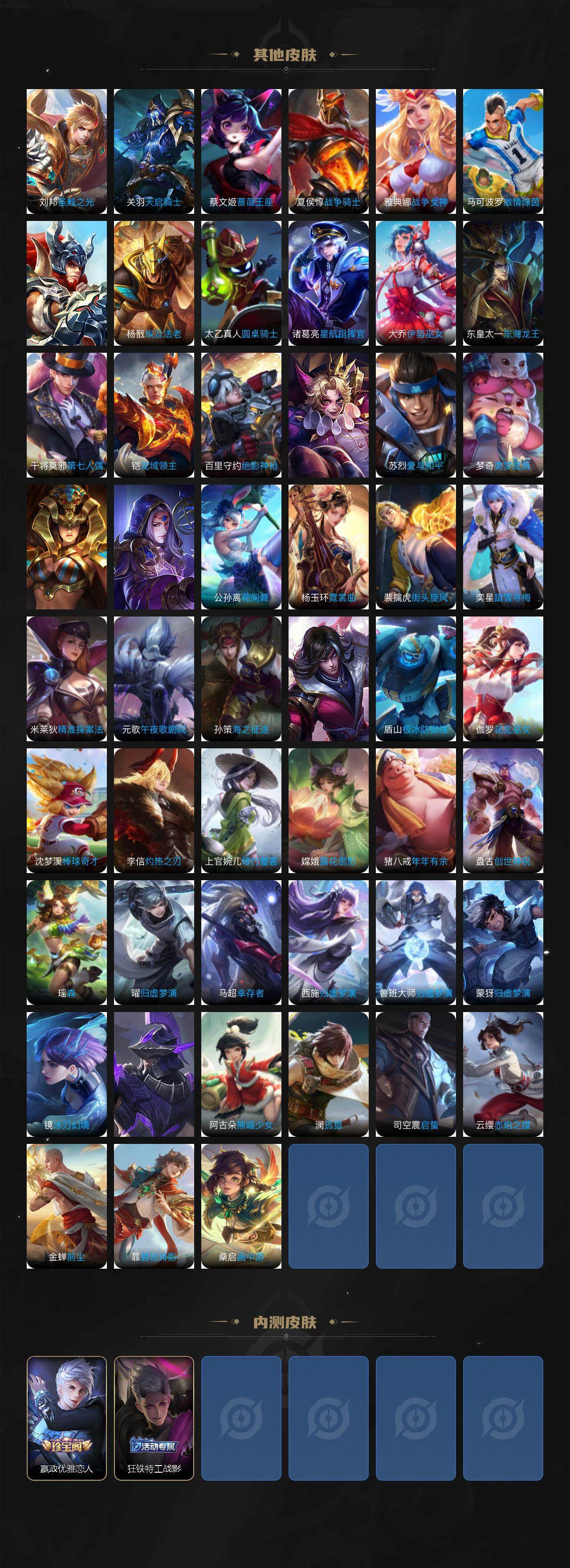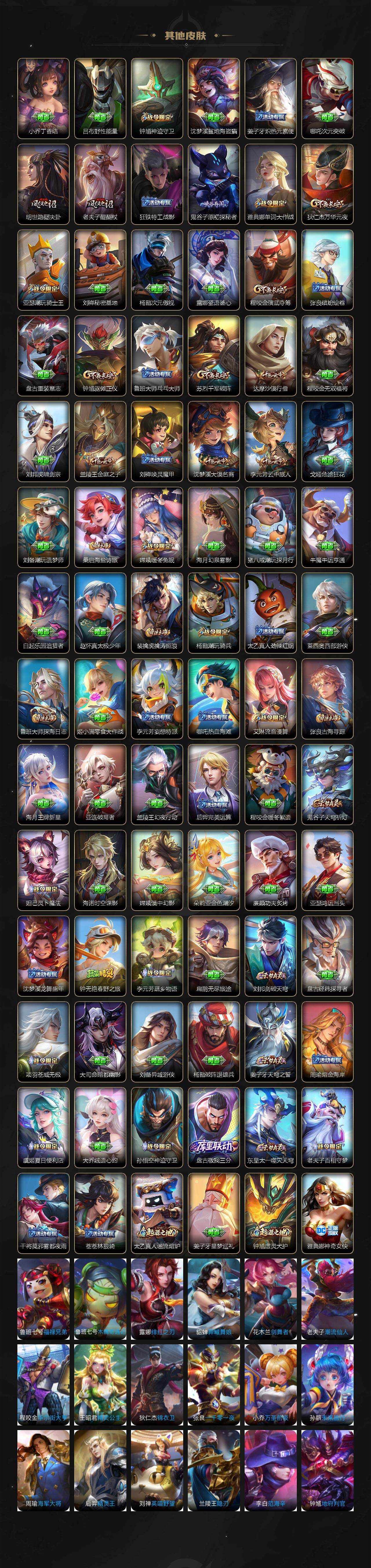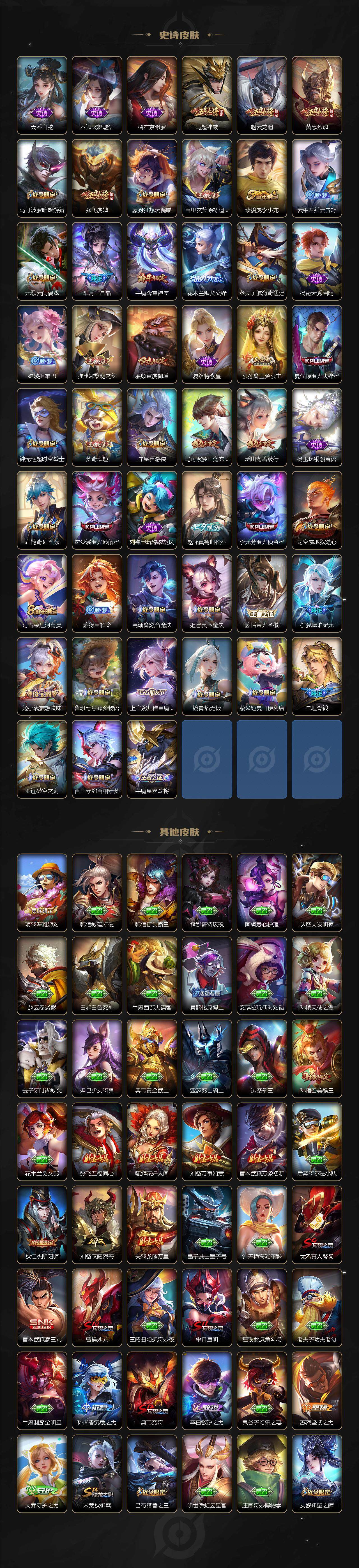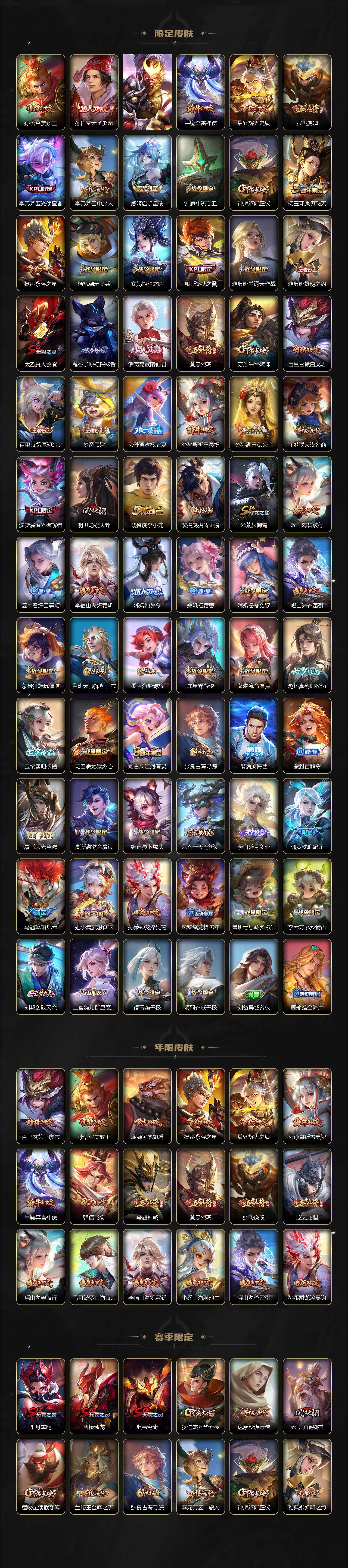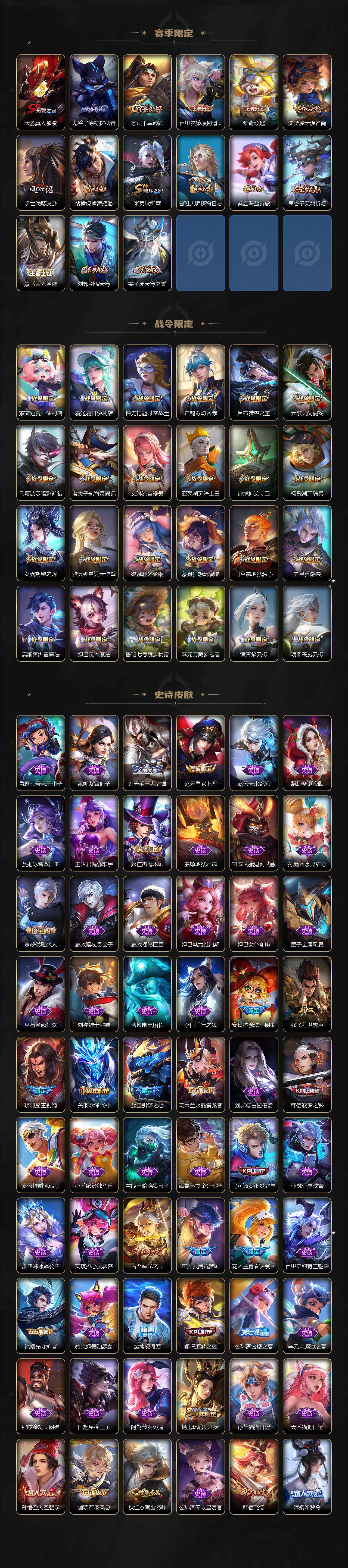 【限定皮肤】:夏侯惇霜北刀,铠冥王哈迪斯,暃埋骨钱,蔡文姬夏日便利店,大乔绒语心约,虞姬夏日便利店,姜子牙天穹之誓,杨戬破阵退雄兵,狄仁杰阴阳师,廉颇寅虎御盾,小乔山海琳琅生,赵云皇家上将,赵云引擎之心,赵云龙胆,嬴政优雅恋人,庄周云端筑梦师,钟无艳王者之锤,钟无艳超时空战士,扁鹊奇幻香踪,芈月重明,芈月白晶晶,吕布天魔缭乱,吕布猎兽之王,元歌云间偶戏,夏侯惇匿光决锋者,曹操烛龙,典韦穷奇,马可波罗逐梦之星,马可波罗暗影游猎,马可波罗山海玄木吟,狄仁杰魔术师,狄仁杰万华元夜,狄仁杰神器狴犴令,达摩沙漠行僧,项羽海滩派对,项羽霸王别姬,老夫子醍醐杖,老夫子航海奇遇记,关羽冰锋战神,安琪拉魔法小厨娘,程咬金演武夺筹,韩信逐梦之影,韩信飞衡,兰陵王默契交锋,兰陵王金庭之子,花木兰青春决赛季,花木兰默契交锋,亚瑟潮玩骑士王,孙悟空美猴王,孙悟空大圣娶亲,孙悟空齐天大圣,牛魔奔雷神使,后羿辉光之辰,张飞虎魄,李元芳匿光侦查者,李元芳云中旅人,虞姬启明星使,钟馗神迹守卫,钟馗驱傩正仪,杨玉环遇见飞天,杨戬永曜之星,杨戬潮玩骑兵,女娲朔望之晖,哪吒逐梦之翼,雅典娜单词大作战,雅典娜黎明之约,太乙真人饕餮,鬼谷子原初探秘者,诸葛亮武陵仙君,黄忠烈魂,苏烈千军破阵,百里玄策白虎志,百里玄策原初追逐者,梦奇顽趣,公孙离蜜橘之夏,公孙离祈雪灵祝,公孙离玉兔公主,沈梦溪大漠名商,沈梦溪匿光破解者,明世隐疑决卦,裴擒虎李小龙,裴擒虎擒涛扼浪,米