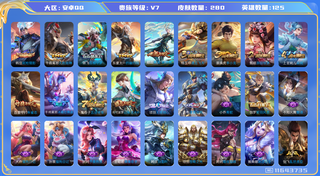 [11643735]【商品标题】:安卓Q-V3-最强王者段位-125英雄-280皮肤-1典藏-0珍品无双-0无双-0珍品传说-5传说-79史诗