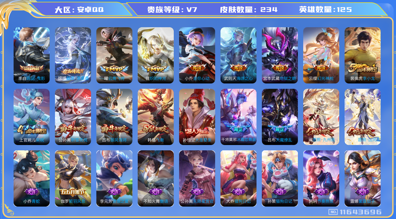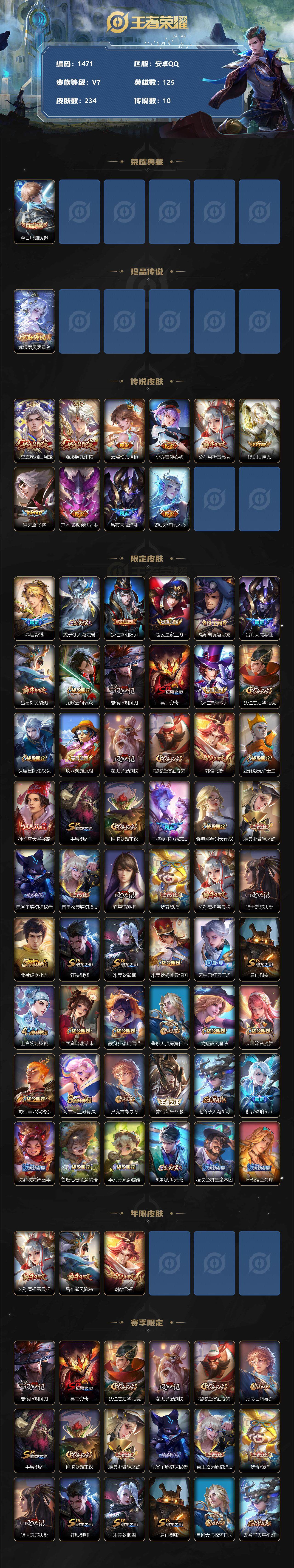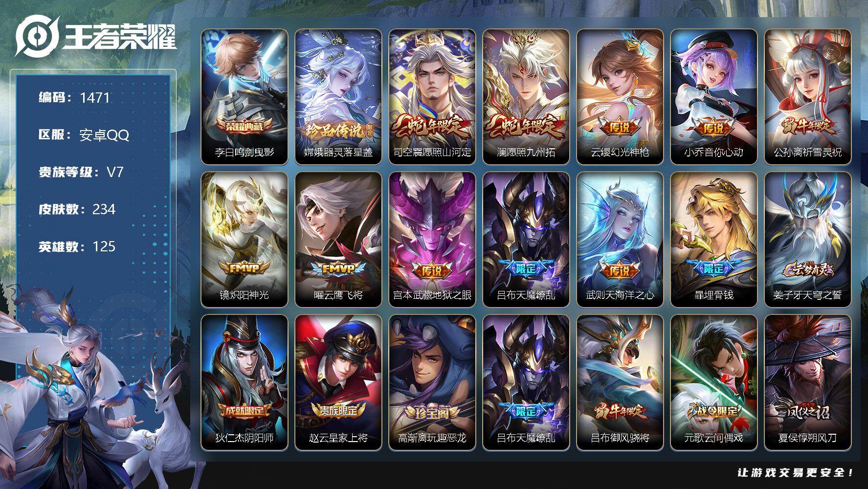 [11643696]【商品标题】:安卓Q-V7-最强王者段位-125英雄-234皮肤-1典藏-0珍品无双-0无双-1珍品传说-10传说-70史诗