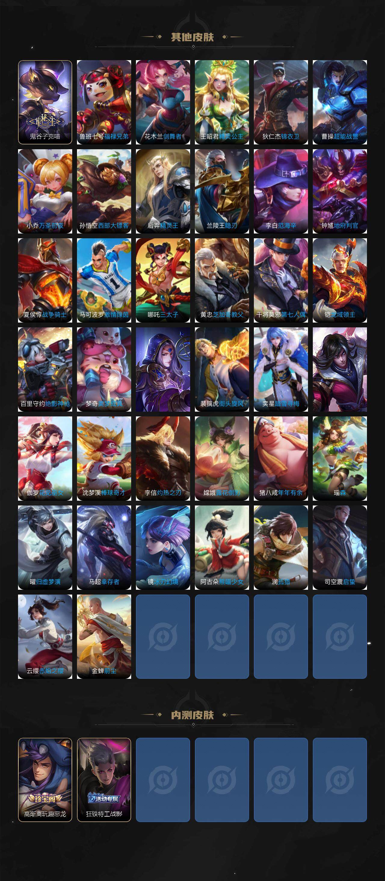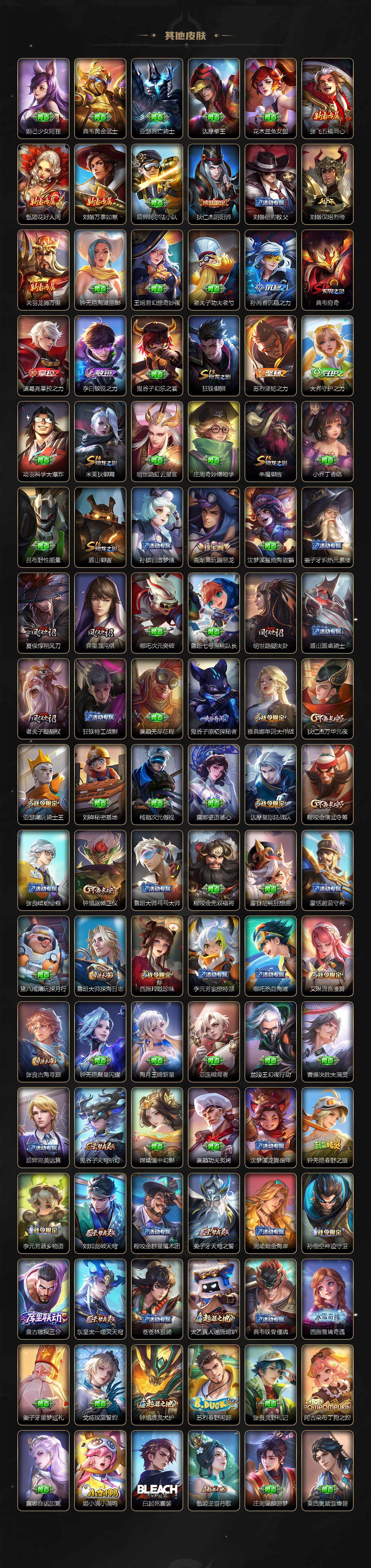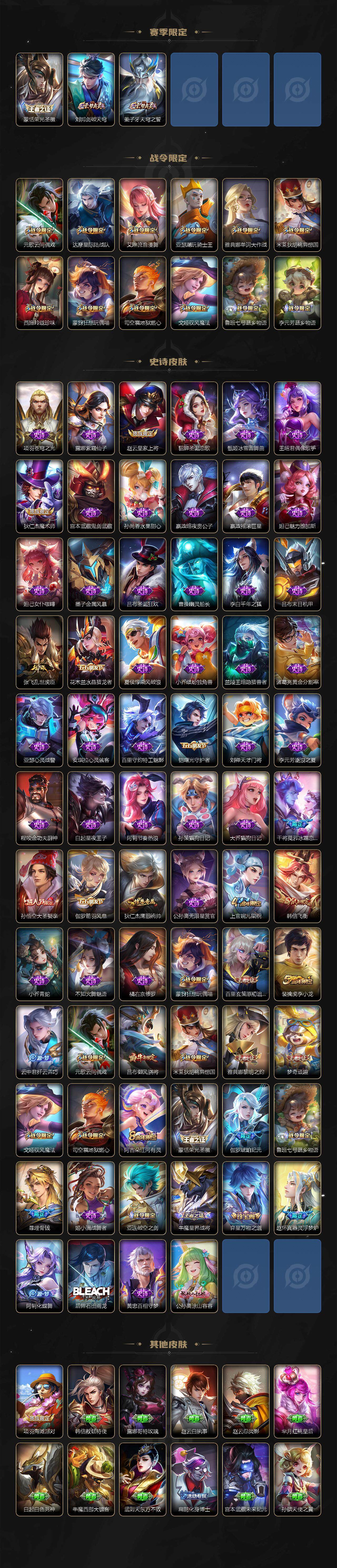 【限定皮肤】:暃埋骨钱,姜子牙天穹之誓,狄仁杰阴阳师,赵云皇家上将,高渐离玩趣恶龙,吕布天魔缭乱,吕布御风骁将,元歌云间偶戏,夏侯惇朔风刀,典韦穷奇,狄仁杰魔术师,狄仁杰万华元夜,达摩星际陆战队,项羽海滩派对,老夫子醍醐杖,程咬金演武夺筹,韩信飞衡,亚瑟潮玩骑士王,孙悟空大圣娶亲,牛魔御旌,钟馗驱傩正仪,干将莫邪冰霜恋舞曲,雅典娜单词大作战,雅典娜黎明之约,鬼谷子原初探秘者,百里玄策原初追逐者,弈星混沌棋,梦奇顽趣,公孙离祈雪灵祝,明世隐疑决卦,裴擒虎李小龙,狂铁御狮,米莱狄御霄,米莱狄胡桃异想国,云中君纤云弄巧,盾山御銮,上官婉儿梁祝,西施玲珑珍味,蒙犽狂想玩偶喵,鲁班大师探海日志,戈娅驭风魔法,艾琳流音漫舞,司空震地狱燃心,阿古朵江河有灵,张良古海寻踪,蒙恬荣光圣徽,鬼谷子天穹祈灯,伽罗琥珀纪元,沈梦溪龙舞盛年,鲁班七号蔬乡物语,李元芳蔬乡物语,刘邦剑破天穹,程咬金群星魔术团,周瑜熔金海岸