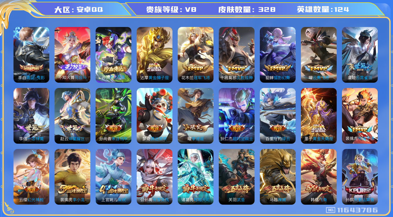 [11643786]【商品标题】:安卓Q-V8-最强王者段位-124英雄-328皮肤-1典藏-0珍品无双-1无双-1珍品传说-25传说-104史诗