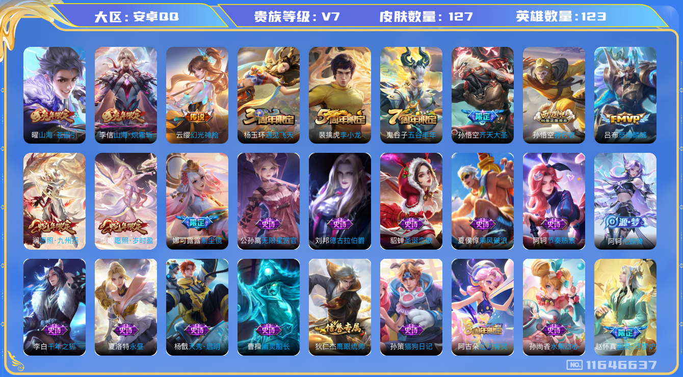 [11646637]V7 8传说 123英雄 127皮肤 可修改实名 优质装备:山海·炽霜斩(李信年限),山海·苍雷引(电光曜子) 传说皮:幻光神枪 珍宝阁皮:女武神 限定皮:愿照·九州拓(澜年限),愿照·岁时盈(虞姬年限),前尘镜,遇见飞天,齐天大圣,怒海麟威,五谷丰年,李小龙,孙行者 史诗皮:器灵·浮梦炉,化蝶舞,千年之狐,永昼,江河有灵,无限星赏官,电玩·爆裂旋风,猫狗日记-孙策,节奏热浪,水果甜心,天才门将,德古拉伯爵,幽灵船长,天秀·启明,乘风破浪,圣诞狂欢,圣诞恋歌,鹰眼统帅,魅力维加斯