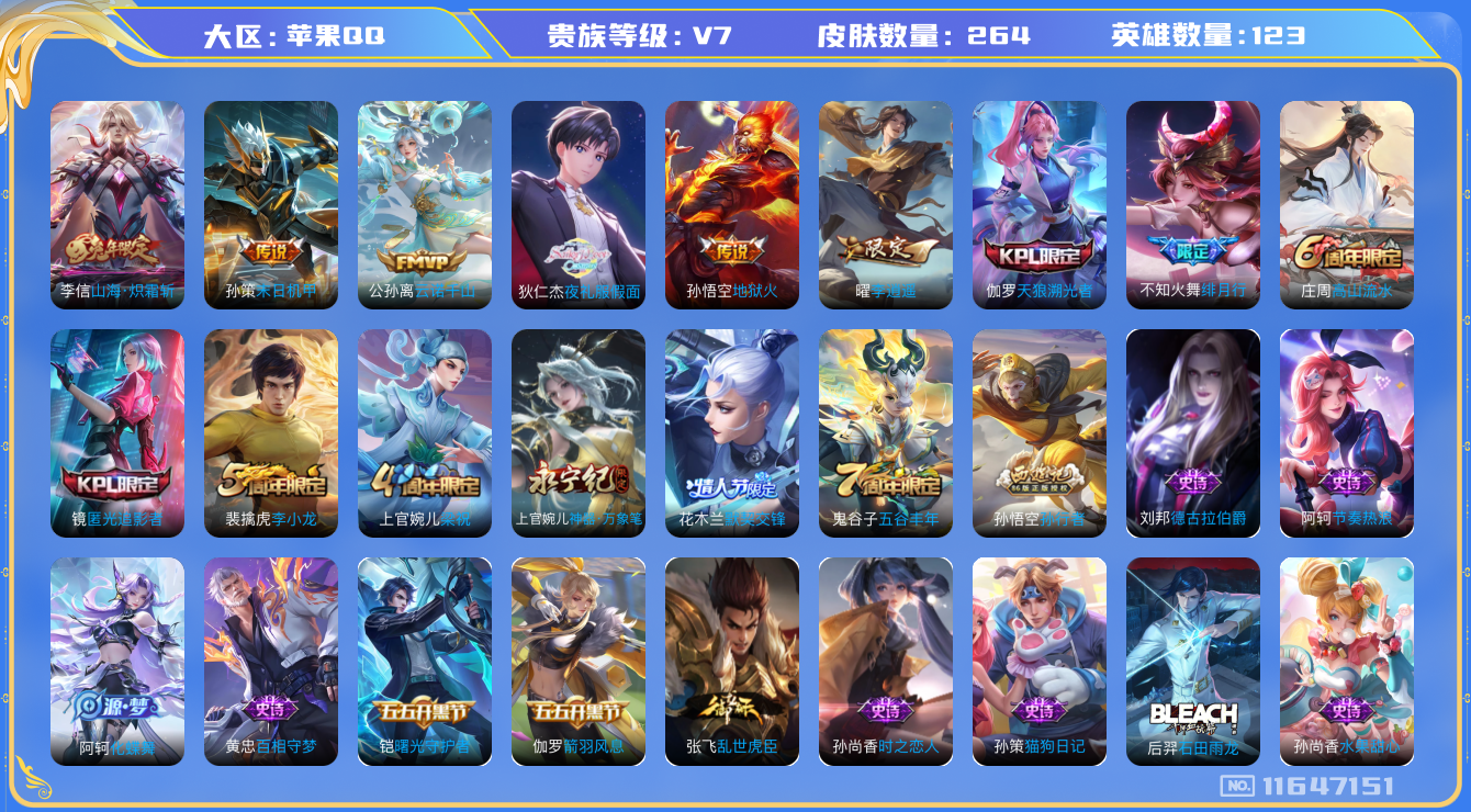 [11647151]V7 7传说 123英雄 264皮肤 可修改实名 优质装备:地狱火,李逍遥,末日机甲-孙策,山海·炽霜斩(李信年限),夜礼服假面 传说皮:云诺千山 珍宝阁皮:蔷薇恋人,女武神 限定皮:绯月行,高山流水,五谷丰年,梁祝,天狼溯光者,李小龙,默契交锋-花木兰,孙行者,匿光追影者,神器·万象笔 史诗皮:鸭鸭历险记-刘禅,化蝶舞,龙之律动,石田雨龙,百相守梦-周瑜,百相守梦-黄忠,紫霞仙子,黄金分割率,特工魅影,千年之狐,永昼,魅语,蒙恬荣光圣徽,无限星赏官,晚萤,末日机甲-吕布,猫狗日记-孙策,时之恋人-孙尚香,乱世虎臣,节奏热浪,修罗,水果甜心,绅士熊喵,星夜王子,功夫厨神,德古拉伯爵,暗隐猎兽者,鬼剑武藏,拒霜思,逐浪之夏,水晶猎龙者,曙光守护者,箭羽风息,金属风暴,原初追逐者,圣诞恋歌,鹰眼统帅,黎明之约,赏金猎手,无心,未来纪元-赵云