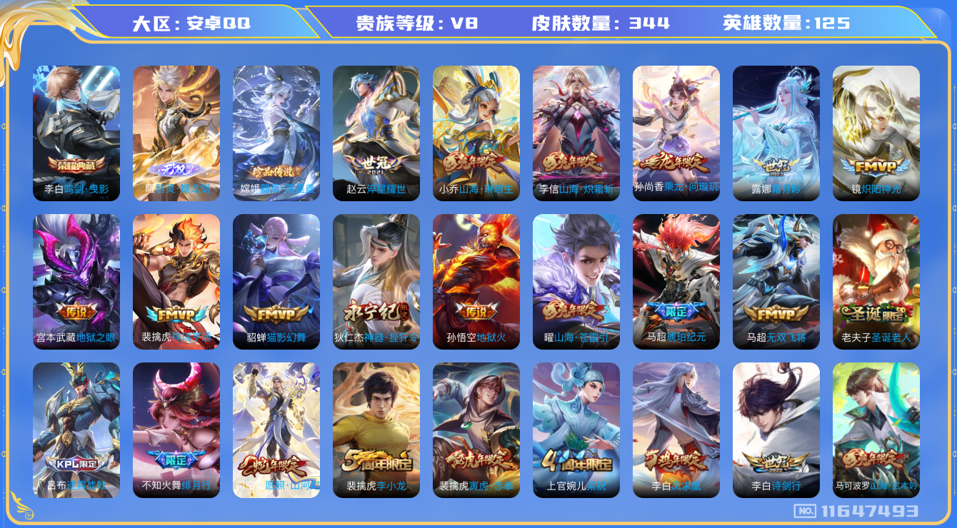 [11647493]V8 1典藏 1无双 1珍品传说 23传说 125英雄 344皮肤 可修改实名 优质装备:鸣剑·曳影,器灵·螭龙剑,器灵·落星盏,猫影幻舞,炽阳神光,地狱火,地狱之眼,淬星耀世,无双飞将,神器·狴犴令,山海·炽霜斩(李信年限),山海·琳琅生(小乔年限),山海·苍雷引(电光曜子),霜月吟,琥珀纪元马超 传说皮:乘龙·问璇玑(孙尚香年限),祥瑞亨通 珍宝阁皮:妄想食味,蔷薇恋人,玩趣恶龙 限定皮:愿照·九州拓(澜年限),愿照·山河定(司空震年限),逐霄战戟,鸣野蒿,至尊宝,凤求凰(白切鸡),傲雪梅枪,绯月行,神威(电光马子),飞衡(韩信年限),山海·碧波行(瑶年限),诗剑行,齐天大圣,五谷丰年,梁祝,李小龙,圣诞老人,孙行者,大圣娶亲,寅虎·赤拳(老虎年限),山海·玄木吟(马可年限),冰霜神祇 史诗皮:飞车小橘子,器灵·浮梦炉,化蝶舞,星界战将,龙之律动,茶境仙,怒海争锋,蔬乡物语(鲁班七号),紫霞仙子,特工魅影,千年之狐,永昼,江河有灵,雪夜绮愿(周瑜),真我赫兹(镜),魅语,百解令(蒙犽),蒙恬荣光圣徽,偶像歌手,晚萤,电玩·爆裂旋风,龙骑士(小龙虾),末日机甲-吕布,猫狗日记-孙策,猫狗日记-大乔,乱世虎臣,节奏热浪,摇滚巨星,水果甜心,绅士熊喵,天才门将,星夜王子,心灵骇客,功夫厨神,德古拉伯爵,暗隐猎兽者,幽灵船长,鬼剑武藏,暗渊魔法,心灵战警,舞动绿茵,地狱岩魂,诗语江南,纤云弄巧,缤纷独角兽,乘风破浪,逐浪之夏,月团寄思,水晶猎龙者,曙光守护者,热力回旋,金属风暴,原初追逐者,圣诞狂欢,圣诞恋歌,鹰眼统帅,王者之锤,魅力维加斯,黎明之约,无心,未来纪元-赵云
