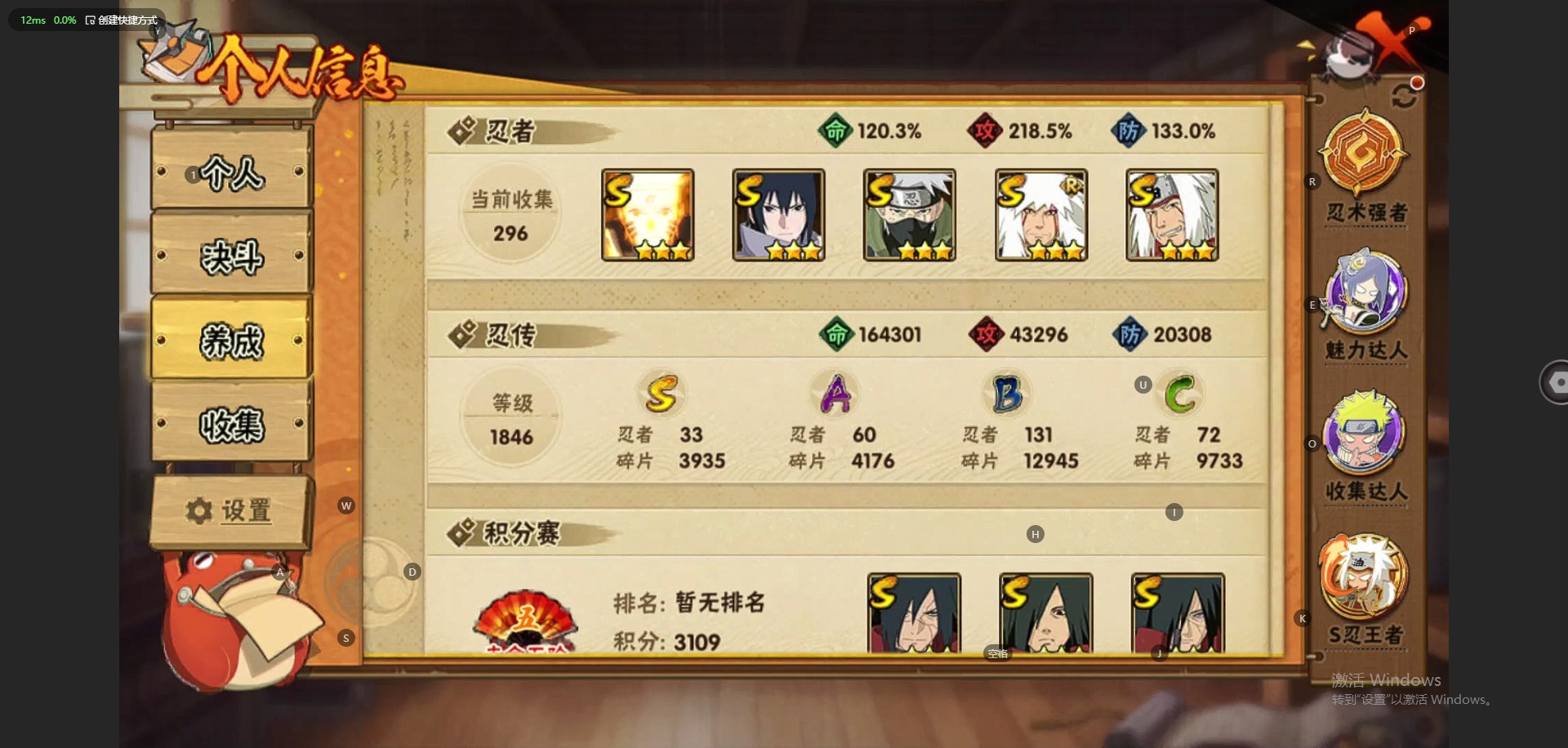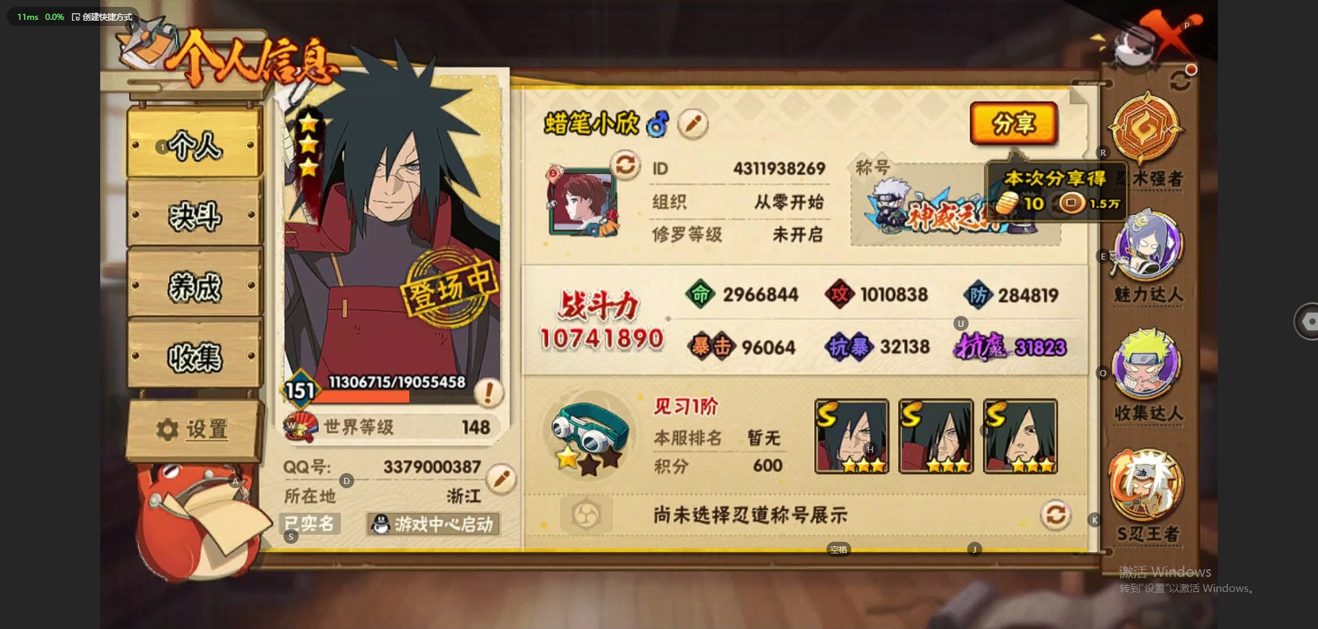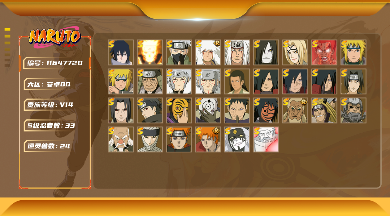 [11647720]V14 33S忍 60A忍 24通灵 1074.1W战力 可二次 可修改实名 优质装备:宇智波鼬「秽土转生」,佩恩·天道「超」,宇智波斑「秽土转生」,艾「三代目雷影」,半藏「秽土转生」,千手扉间「秽土转生」,纲手「百豪」,无「二代目土影」,波风水门「秽土转生」,金角/银角「秽土转生」,猿飞日斩「秽土转生」,宇智波斑,千手扉间,神秘面具男,迈特凯「死门」,宇智波带土 「忍界大战」,“宇智波斑” 「白面具」,漩涡鸣人 「九喇嘛连结」,大筒木金式「博人传」,神秘面具男 「红夜之刃」,宇智波佐助「永恒万花筒」,千手柱间·木叶创立,宇智波斑「秽土转生·解」,大筒木桃式,宇智波止水「须佐能乎」,旗木卡卡西「须佐能乎」 S级忍者:大野木 「忍界大战」,自来也 「舞之豪杰」,宇智波鼬 「须佐能乎」,佩恩「天道」,波风水门,大蛇丸,自来也