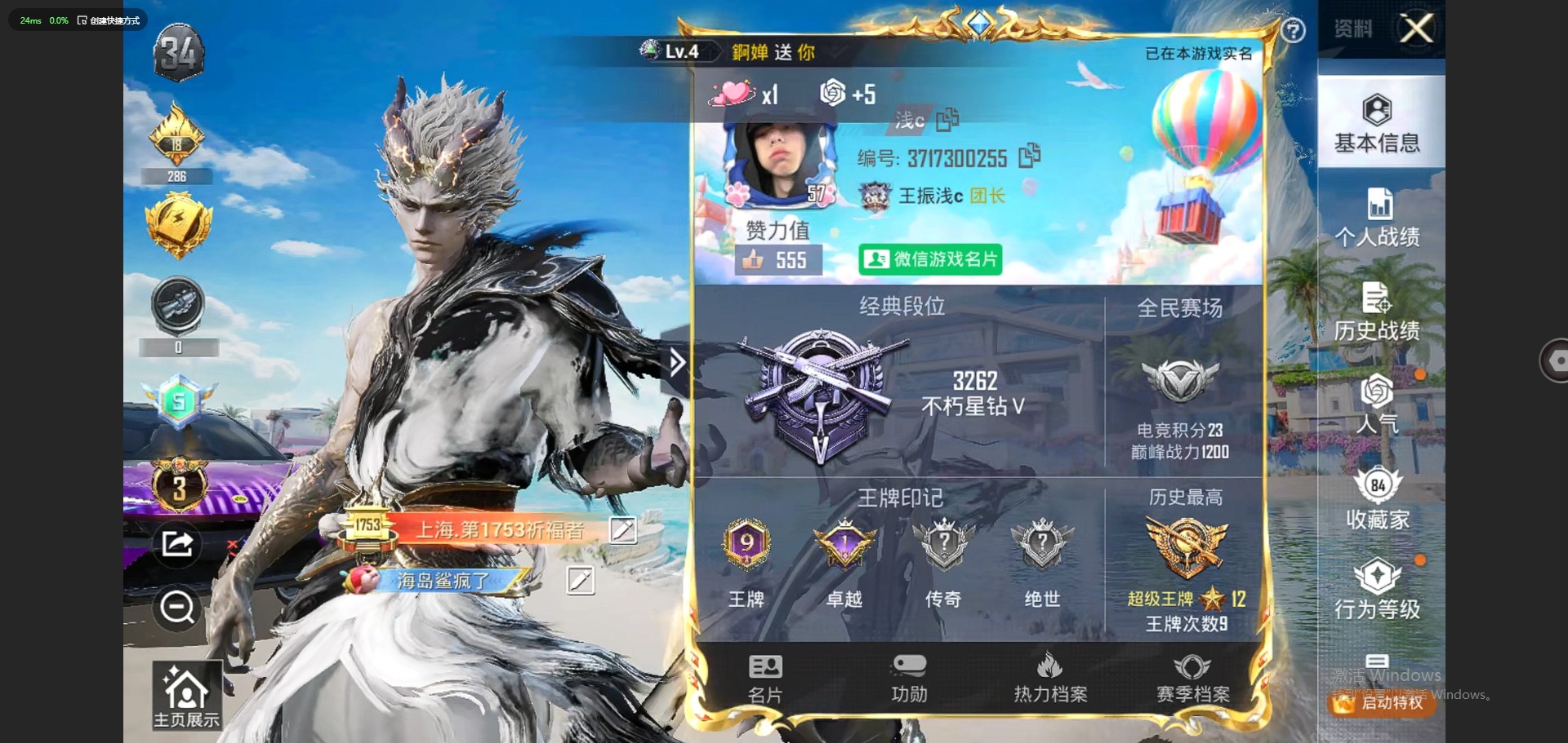 - PX_2095013-实名: 不可修改 贵族等级: V4 英雄数: 31 皮肤数: 18 限定皮: 无限倾心-虞姬