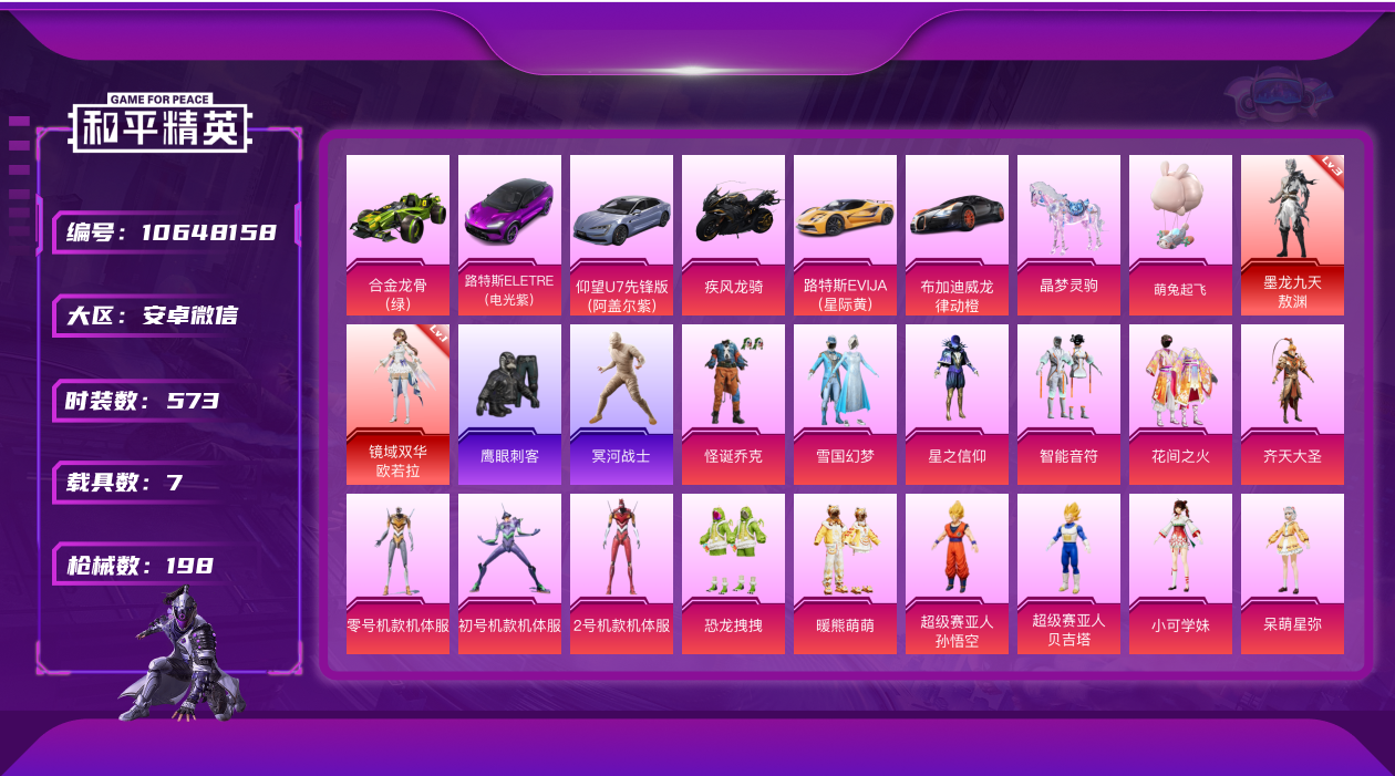 [10648158]2红装 35粉装 25特效枪 7载具 9印记 可二次 安全保护中 身法装备:冥河战士(老木乃伊),零号机款机体服(黄螳螂),初号机款机体服(紫螳螂),2号机款机体服(红螳螂),8号机(新粉螳螂),Mark.06(新蓝螳螂),萌熊伴侣背包(粉熊背包) 三级神装:三级墨龙九天-敖渊(3级敖渊3级野人) 一级神装:一级镜域双华-欧若拉(1级欧若拉) 九级特效枪:九级M416-至情至圣(满级至情至圣M416) 热门装扮:零号机款机体服(黄螳螂),初号机款机体服(紫螳螂),2号机款机体服(红螳螂),冷漠罗丽,冥河战士(老木乃伊),梦幻火箭(新101)(新火箭少女101粉色套装),雪国幻梦(冰雪女王),花间之火,怪诞乔克(小丑),星之信仰,智能音符,齐天大圣,恐龙拽拽,暖熊萌萌,超级赛亚人孙悟空,超级赛亚人贝吉塔,呆萌星弥,白勺歌姬(玉足),小可学妹,圣堂之誓,繁龙极客,蜜语绒猫,绝色倾城,辉耀战甲,鎏金朋克,烟云彩露,严莉莉,美雪,美琪,小蓝,光极星,电磁星,脉冲星,霓虹漫游,星空武士,鸢尾晶梦,鹰眼刺客 载具:晶梦灵驹,仰望U7先锋版(阿盖尔紫),路特斯ELETRE(电光紫),合金龙骨(绿),路特斯EVIJA(星际黄),僚机-萌兔起飞,布加迪威龙(律动橙),疾风龙骑 稀有枪皮:Kar98K-巳巳如意,M416墨龙九天,AMR鸢尾晶梦,破片手榴弹粉粉猫爪,AKM-幽焰骑士,M416电玩时刻,Mk14精灵梦叶罗丽,M416至情至圣,M416风花雪月,SCAR-L青春物语,UMP45恐龙拽拽,AKM白勺歌姬,Vector灵感创作师,AKM盖世英雄,SCAR-L天蓬元帅,M416全功率超战,AKM绿萝繁花,SCAR-L-锦绣绵绵,SPAS-12蜜语绒猫,M24镜域双华,蜜獾辉耀战甲,PKM江南烟雨,Groza巴啦啦小魔仙,M762-电糖天使,P90-电糖天使 神级装扮:墨龙九天-敖渊(野人),镜域双华-欧若拉 五级载具:五级路特斯ELETRE(电光紫) 六级特效枪:六级破片手榴弹粉粉猫爪,六级SCAR-L-天蓬元帅,六级AKM-盖世英雄 五级特效枪:五级Kar98K-巳巳如意,五级M416-电玩时刻,五级SCAR-L-锦绣绵绵,五级AKM-绿萝繁花 四级特效枪:四级蜜獾-辉耀战甲,四级UMP45-恐龙拽拽,四级Vector-灵感创作师 三级特效枪:三级AKM-幽焰