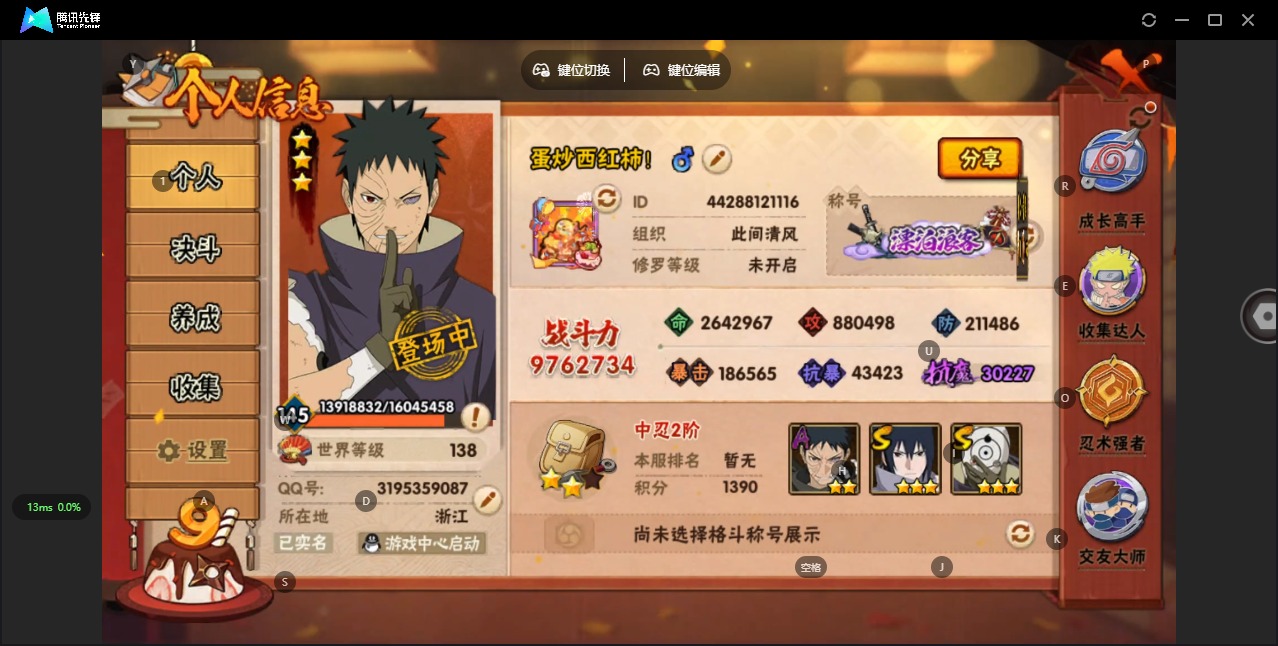 [11649634]V11 19S忍 35A忍 19通灵 976.2W战力 可二次 可修改实名 优质装备:熊猫,猿飞日斩「秽土转生」,长门「秽土转生」,迈特凯「死门」,宇智波带土 「忍界大战」,“宇智波斑” 「白面具」,漩涡鸣人 「九喇嘛连结」,神秘面具男 「红夜之刃」,宇智波佐助「永恒万花筒」,千手柱间·木叶创立,宇智波斑「秽土转生·解」,大筒木桃式,艾「忍界大战」,大筒木舍人 「最终章」 S级忍者:自来也 「舞之豪杰」,宇智波鼬 「须佐能乎」,佩恩「天道」,波风水门,大蛇丸,自来也
