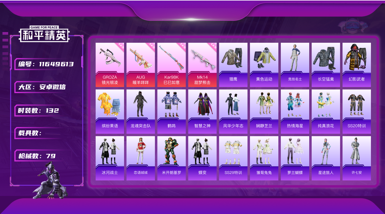 [11649613]4特效枪 可二次 可修改实名 安全保护中 稀有枪皮:Kar98K-巳巳如意,AUG-暖羊咩咩,GROZA-镜光银凌,MK14-甜梦熊击 五级特效枪:五级MK14-甜梦熊击,五级GROZA-镜光银凌,五级Kar98K-巳巳如意,五级AUG-暖羊咩咩 紫色装扮:SS20特训,SS31特训套装,SS33特训套装,娴静芝兰,缤纷果语,冰河战士,龙魂突击队,蝶变,长空猛禽,黄色运动,鹤鸣,幻影武者,猎鹰,雏菊兔兔,萝兰蝴蝶,SS29特训,米开朗基罗,纯真浪花,热情海星,鱼渊荷华,燕燕于飞,巳巳如意,星途旅人,竞技名士,许七安,大橘大利,星渊小夜曲,小鸟芋圆,智慧之神,风华少年志,恋语绒绒,樱梦幻音,蓝冰羽,紫幽梦,SS32特训服(SS32特训套装),智谋强哥 优质战备:时空协奏降落伞,霓虹漫游降落伞,繁龙极客飞行器,临安公主降落伞,月下星之子降落伞,彩虹独角兽降落伞,神秘黑猫降落伞,烈焰拳霸降落伞