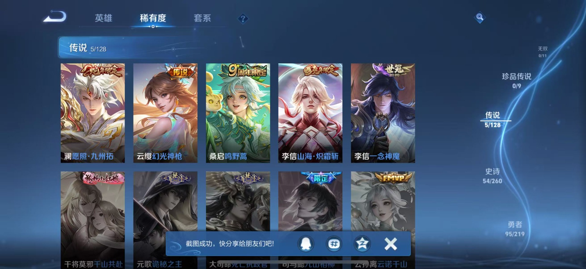 - [11881147]V6 1典藏 2传说 124英雄 244皮肤 可修改实名 荣耀水晶:鸣剑·曳影 传说皮:黄金狮子座 珍宝阁皮:优雅恋人,蔷薇恋人 限定皮:鸣野蒿,至尊宝,傲雪梅枪,五谷丰年,冰锋战神,梁祝,李小龙,默契交锋-花木兰 史诗皮:鸭鸭历险记-刘禅,龙之律动,石田雨龙,紫霞仙子,苍穹之光,特工魅影,千年之狐,冰冠公主,偶像歌手,魅语,暗夜猫娘,龙骑士(小龙虾),末日机甲-吕布,猫狗日记-孙策,乱世虎臣,女仆咖啡,摇滚巨星,水果甜心,星夜王子,心灵骇客,功夫厨神,暗隐猎兽者,幽灵船长,鬼剑武藏,心灵战警,天秀·启明,纤云弄巧,繁星吟游(呼啦呼啦),缤纷独角兽,乘风破浪,逐浪之夏,月团寄思,水晶猎龙者,金属风暴,圣诞狂欢,圣诞恋歌,鹰眼统帅,魅力维加斯,黎明之约,无心,未来纪元-赵云