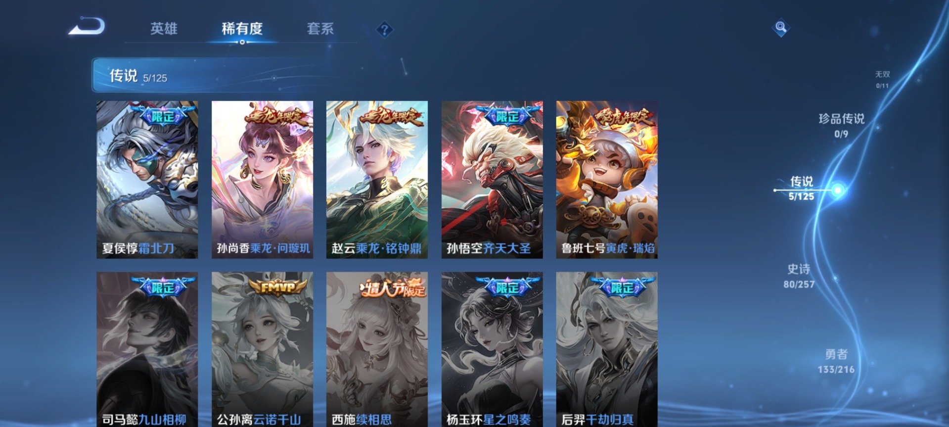 - PX_2096210-79 苹果QQ/至尊星耀/334皮肤/125英雄/1典藏/0珍品无双/0无双/0珍品传说/17传说/90史诗/9稀有英雄 【1 典藏皮肤】鸣剑·曳影 李白, 【17 传说皮肤】启明星使 虞姬,逐花归海 澜,无双飞将 马超,白虎志 百里玄策,凤求凰 李白,诗剑行 李白,仲夏夜之梦 貂蝉,炽阳神光 镜,霜月吟 露娜,怒海麟威 吕布,久胜战神 干将莫邪,末日机甲 孙尚香,一念神魔