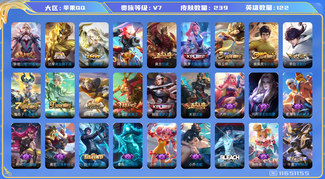 [11651155]V7 7传说 122英雄 239皮肤 可修改实名 优质装备:黄金狮子座,炽阳神光,山海·炽霜斩(李信年限),电玩·雷克斯 珍宝阁皮:蔷薇恋人,玩趣恶龙 限定皮:鸣野蒿,遇见飞天,诗剑行,五谷丰年,武圣,烈魂,天狼溯光者,李小龙,逐梦之影,孙行者,美猴王 史诗皮:星界战将,谪仙醉月,石田雨龙,怒海争锋,破空之剑,紫霞仙子,黄金分割率,千年之狐,真我赫兹(百里守约),百解令(蒙犽),蒙恬荣光圣徽,冰冠公主,青蛇,暗夜猫娘,龙骑士(小龙虾),末日机甲-吕布,猫狗日记-大乔,水果甜心,星夜王子,心灵骇客,功夫厨神,德古拉伯爵,暗隐猎兽者,幽灵船长,鬼剑武藏,心灵战警,舞动绿茵,缤纷独角兽,乘风破浪,逐浪之夏,水晶猎龙者,曙光守护者,金属风暴,原初追逐者,圣诞狂欢,圣诞恋歌,鹰眼统帅,魅力维加斯,黎明之约,赏金猎手,无心,未来纪元-赵云