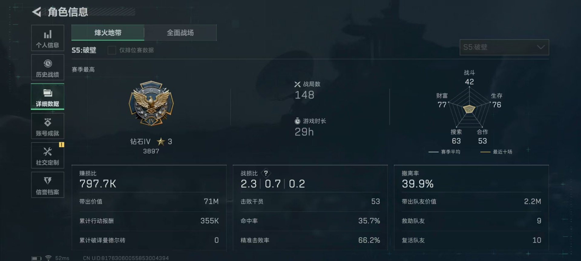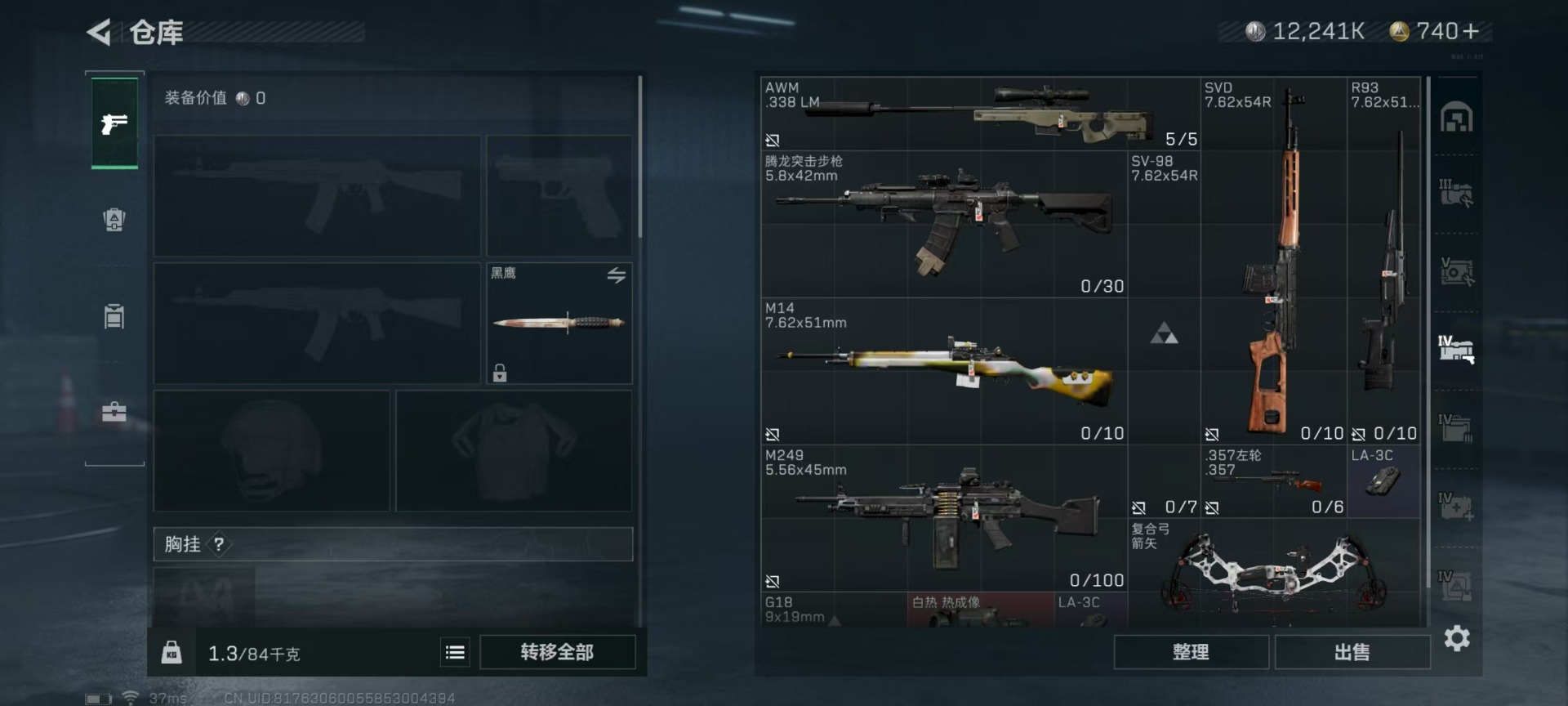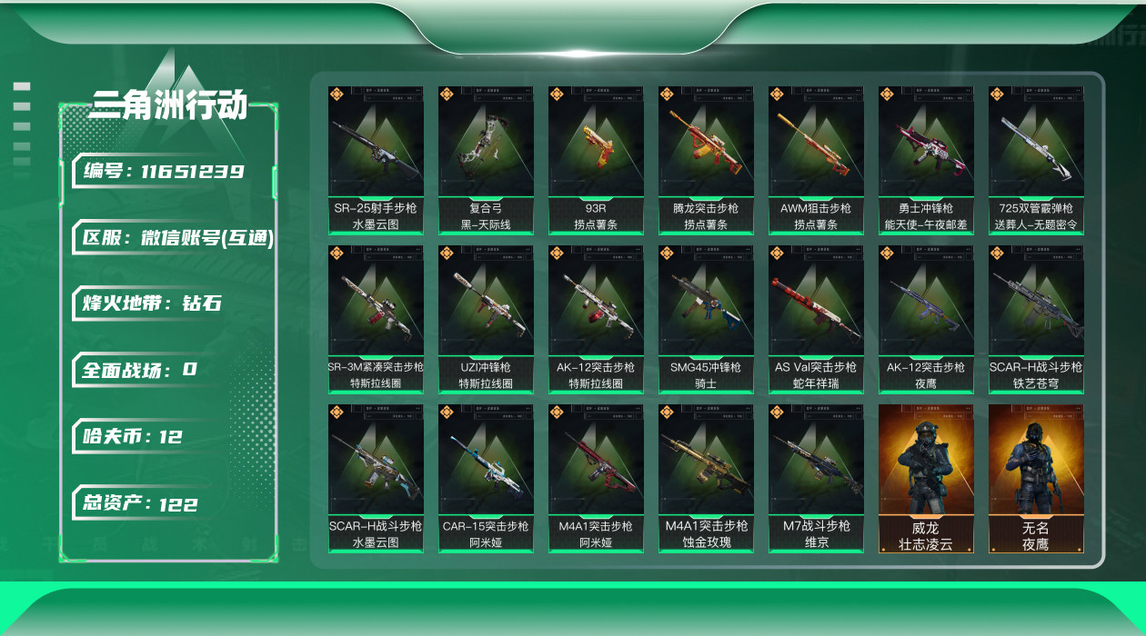 [11651239]总资产:122M 6干员外观 19传说枪械 哈夫币:12.241K 高级安全箱(2×3)9.15号到期 可二次 可修改实名 安全保护中 烽火地带段位:钻石 全面战场段位:军士长 传说武器皮肤:SR-25射手步枪-水墨云图,SCAR-H战斗步枪-水墨云图,AS Val突击步枪-蛇年祥瑞,SCAR-H战斗步枪-铁艺苍穹,SMG45冲锋枪-骑士,UZI冲锋枪-特斯拉线圈,AWM狙击步枪-捞点薯条,腾龙突击步枪-捞点薯条,93R-捞点薯条,AK-12突击步枪-特斯拉线圈,SR-3M紧凑突击步枪-特斯拉线圈,勇士冲锋枪-能天使-午夜邮差,复合弓-黑-天际线,725双管霰弹枪-送葬人-无题密令,M4A1突击步枪-阿米娅,CAR-15突击步枪-阿米娅,AK-12突击步枪-夜鹰,M7战斗步枪-维京,M4A1突击步枪-蚀金玫瑰 干员外观:牧羊人-街头之王,威龙-壮志凌云,骇爪-水墨云图,无名-夜鹰,蜂医-送葬人·无题密令(S5),露娜-黑·天际线