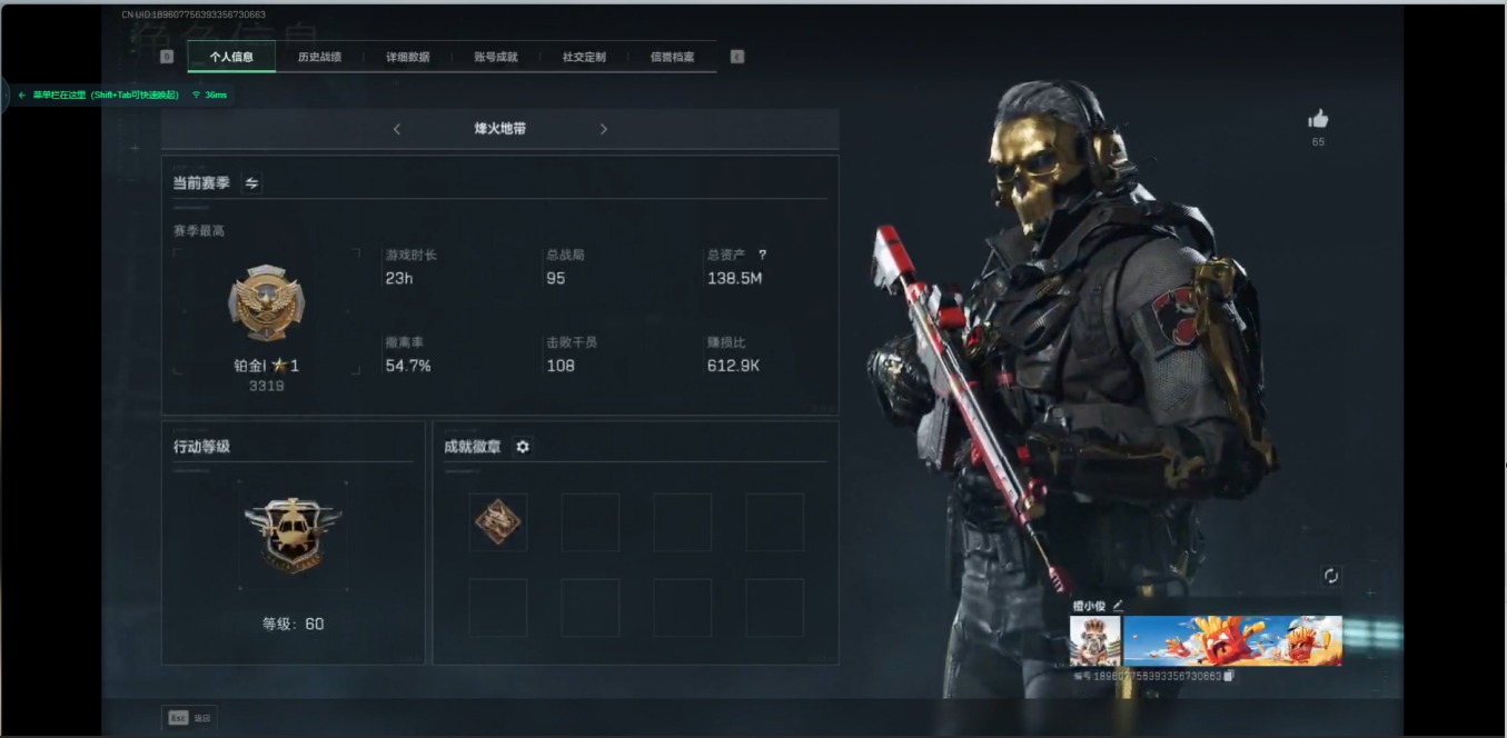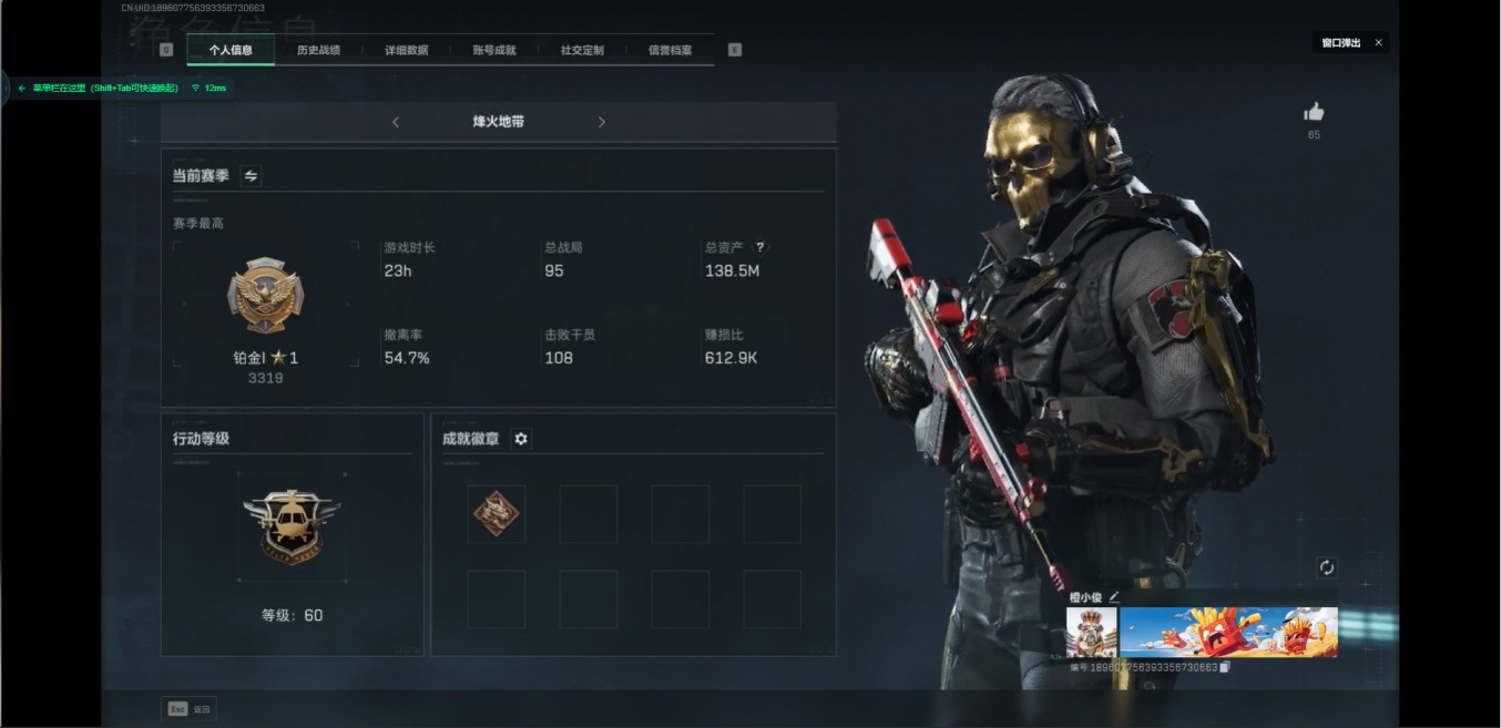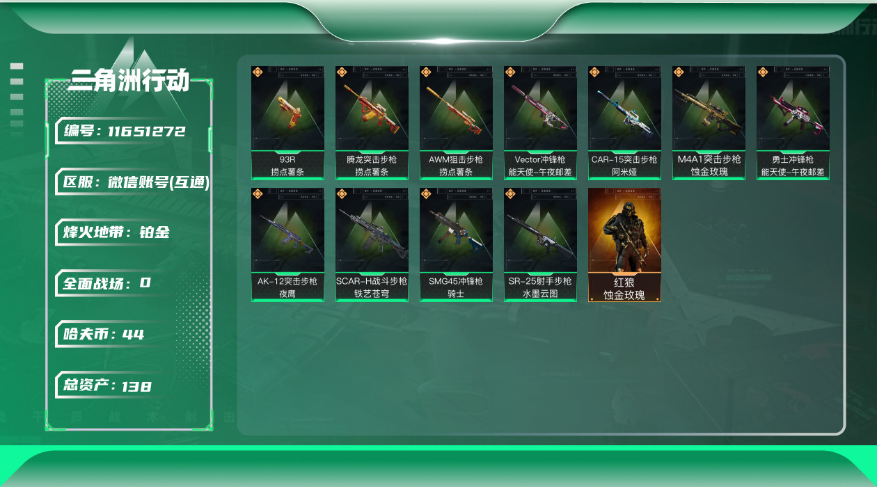 [11651272]总资产:138.5M 1干员外观 11传说枪械 哈夫币:44.557K 进阶安全箱(9.17到期) 可二次 可修改实名 烽火地带段位:铂金 全面战场段位:无段位 传说武器皮肤:SR-25射手步枪-水墨云图,SCAR-H战斗步枪-铁艺苍穹,SMG45冲锋枪-骑士,AWM狙击步枪-捞点薯条,腾龙突击步枪-捞点薯条,93R-捞点薯条,勇士冲锋枪-能天使-午夜邮差,Vector冲锋枪-能天使-午夜邮差,CAR-15突击步枪-阿米娅,AK-12突击步枪-夜鹰,M4A1突击步枪-蚀金玫瑰 干员外观:红狼-蚀金玫瑰