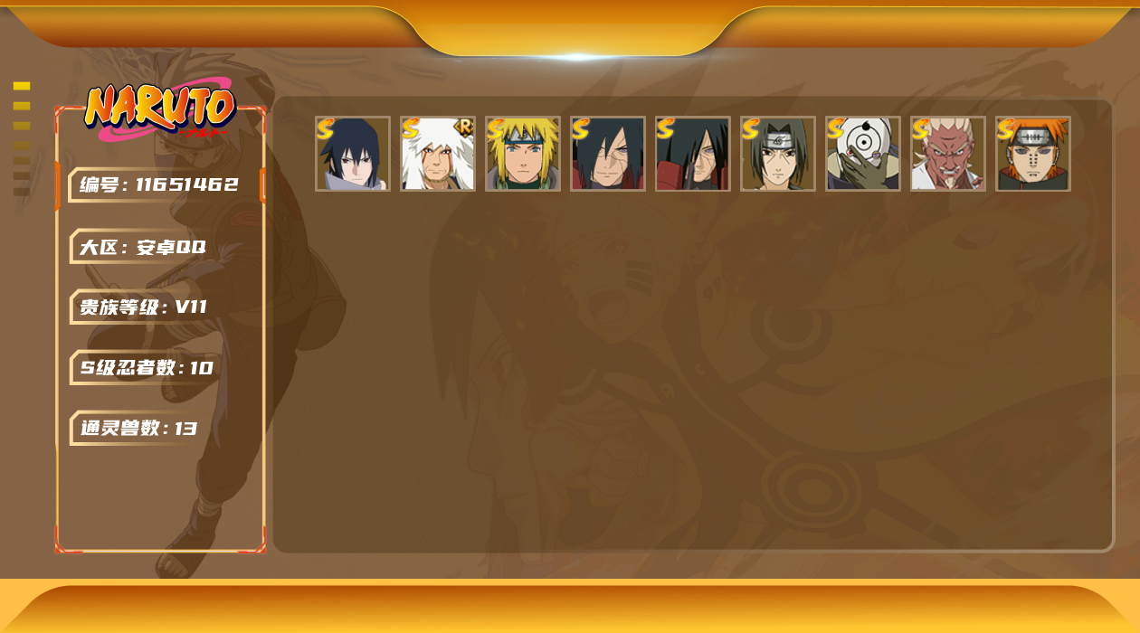 [11651462]V11 10S忍 16A忍 13通灵 393.1W战力 可二次 可修改实名 优质装备:宇智波斑「秽土转生」,“宇智波斑” 「白面具」,宇智波佐助「永恒万花筒」,宇智波斑「秽土转生·解」,艾「忍界大战」 S级忍者:自来也 「舞之豪杰」,宇智波鼬 「须佐能乎」,佩恩「天道」,波风水门