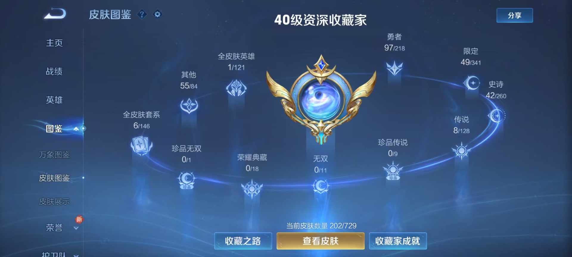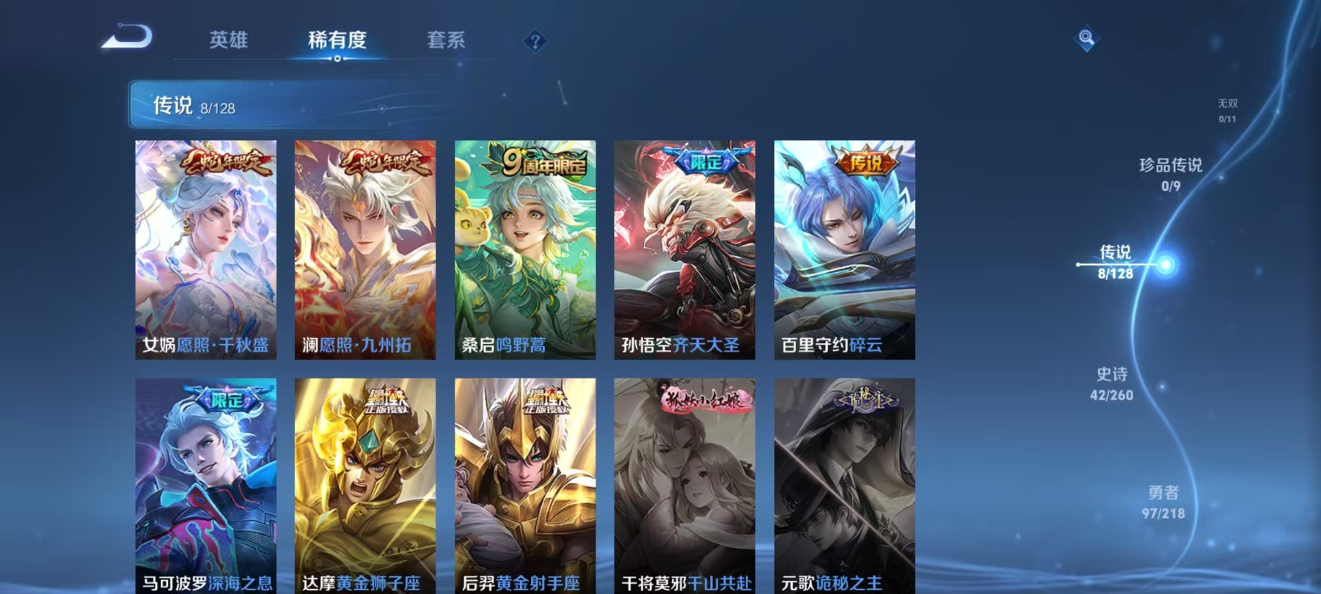 - PX_2113749-实名: 可修改 贵族等级: V7 英雄数: 123 皮肤数: 263 荣耀水晶: 鸣剑·曳影 珍品传说: 朽木白哉 传说皮: 黄金射手座,黄金白羊座,时之恋人-刘备,山海·苍雷引,幻光神枪,云诺千山 限定皮: 李小龙,游园惊梦,岱宗,朱雀志,寅虎·瑞焰,高山流水,孙行者,傲雪梅枪,时之祈愿-云中君,百木心枪,玉兔公主,前尘镜,五谷丰年,山海·玄木吟,鸣野蒿,逐霄战戟