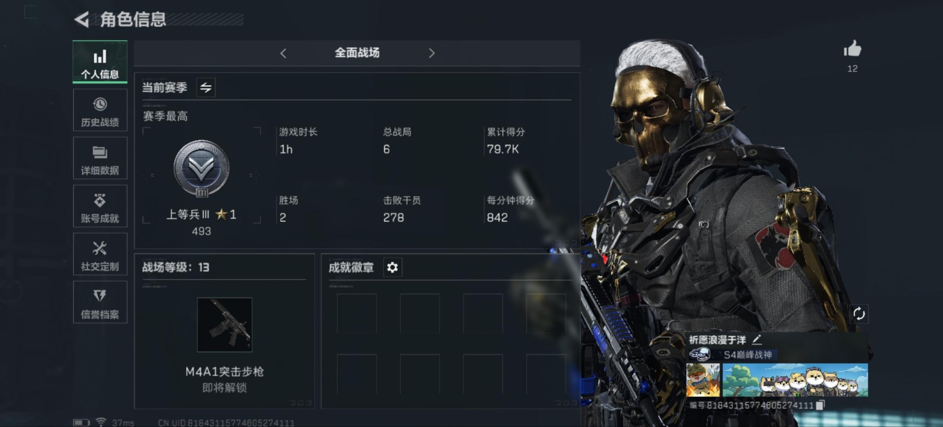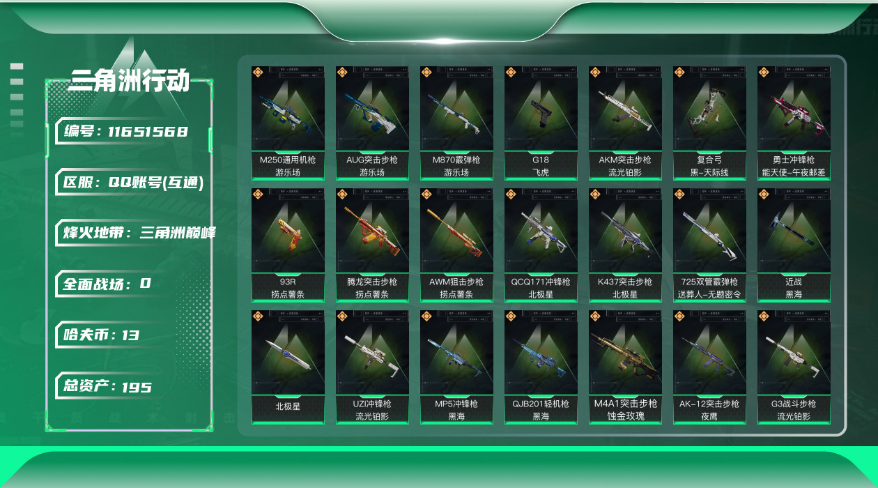 [11651568]总资产:195.2M 2干员外观 2近战传说 22传说枪械 哈夫币:13.348K 高级安全箱(2×3)9.15号到期 可二次 可修改实名 优质装备:近战-黑海,近战-北极星 烽火地带段位:三角洲巅峰 全面战场段位:上等兵 传说武器皮肤:AKM突击步枪-流光铂影,AK-12突击步枪-夜鹰,UZI冲锋枪-流光铂影,G18-飞虎,G3战斗步枪-流光铂影,CAR-15突击步枪-阿米娅,复合弓-黑-天际线,AWM狙击步枪-捞点薯条,QCQ171冲锋枪-北极星,腾龙突击步枪-捞点薯条,93R-捞点薯条,勇士冲锋枪-能天使-午夜邮差,725双管霰弹枪-送葬人-无题密令,K437突击步枪-北极星,MP5冲锋枪-黑海,AUG突击步枪-游乐场,M870霰弹枪-游乐场,M250通用机枪-游乐场,QJB201轻机枪-黑海,M4A1突击步枪-蚀金玫瑰 干员外观:红狼-蚀金玫瑰,蜂医-送葬人·无题密令(S5)