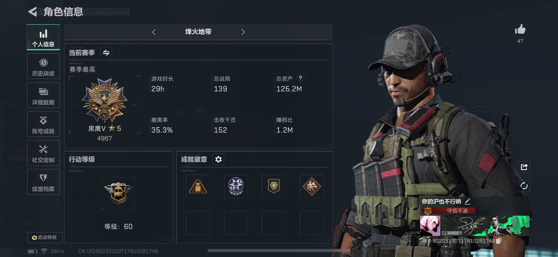 [11651579]总资产:125.2M 1干员外观 10传说枪械 哈夫币:1.356K 高级安全箱(2×3)9.15号到期 可二次 可修改实名 烽火地带段位:黑鹰 全面战场段位:军士长 传说武器皮肤:SR-25射手步枪-水墨云图,SCAR-H战斗步枪-水墨云图,AS Val突击步枪-蛇年祥瑞,SCAR-H战斗步枪-铁艺苍穹,SMG45冲锋枪-骑士,勇士冲锋枪-能天使-午夜邮差,复合弓-黑-天际线,725双管霰弹枪-送葬人-无题密令,AK-12突击步枪-夜鹰,M4A1突击步枪-蚀金玫瑰 史诗武器皮肤:Ash-12战斗步枪-守夜人,M16A4突击步枪-竞赛选手,AS Val突击步枪-尖端治疗,M700狙击步枪-守夜人,SG552突击步枪-尖端治疗,MP5冲锋枪-深海恐惧,PKM通用机枪-荒野求生,SV-98狙击步枪-囚徒,PSG-1射手步枪-无垢,SVD狙击步枪-荒野求生,SR-3M紧凑突击步枪-荒野求生 干员外观:红狼-蚀金玫瑰