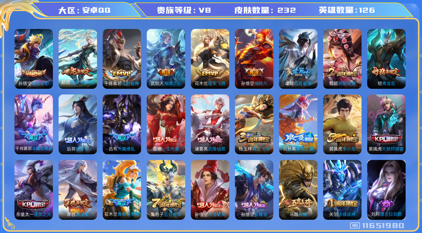 [11651980]V8 1典藏 10传说 126英雄 232皮肤 典藏英雄武则天 可修改实名 优质装备:全息碎影(猴子典藏),冠军飞将,久胜战神,云霓雀翎,地狱火,海洋之心 传说皮:乘龙·铭钟鼎(赵云年限) 珍宝阁皮:女武神 限定皮:至尊宝,凤求凰(白切鸡),武陵仙君(小桃花),神威(电光马子),遇见飞天,五谷丰年,青龙志(铠年限),冰锋战神,游园惊梦,天狼狩猎者,李小龙,逐梦之光,如梦令-后羿,一生所爱,大圣娶亲,天魔缭乱,青春决赛季,冰霜恋舞曲,蜜橘之夏 史诗皮:赞萌露比,龙之律动,石田雨龙,守夜人,紫霞仙子,苍穹之光,白龙吟,黄金分割率,特工魅影,千年之狐,魅语,冰冠公主,偶像歌手,晚萤,猫狗日记-孙策,时之恋人-孙尚香,乱世虎臣,修罗,女仆咖啡,摇滚巨星,水果甜心,天才门将,星夜王子,功夫厨神,德古拉伯爵,暗隐猎兽者,幽灵船长,心灵战警,舞动绿茵,纤云弄巧,繁星吟游(呼啦呼啦),乘风破浪,逐浪之夏,水晶猎龙者,原初追逐者,圣诞狂欢,圣诞恋歌,鹰眼统帅,暗夜贵公子,魅力维加斯