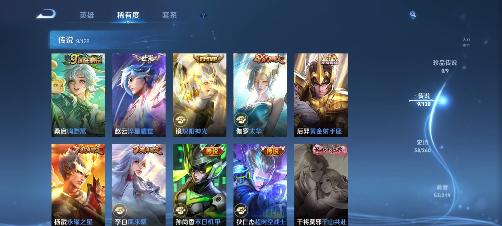 - [11528875]V7 1典藏 2珍品传说 16传说 125英雄 242皮肤 可修改实名 优质装备:鸣剑·曳影,江户川柯南,怪盗基德,一念神魔,仲夏夜之梦(大飞蛾),胖达荣荣,超时空战士-狄仁杰 传说皮:星之鸣奏,祥瑞亨通,幻光神枪 珍宝阁皮:妄想食味,蔷薇恋人 限定皮:愿照·九州拓(澜年限),愿照·福禄聚(蔡文姬年限),愿照·岁时盈(虞姬年限),愿照·山河定(司空震年限),愿照·众生和(妲己年限),愿照·千秋盛(女娲年限),逐霄战戟,鸣野蒿,异界灵契(白毛香),傲雪梅枪,绯月行,神威(电光马子),高山流水,五谷丰年,梁祝,岱宗(典韦年限),李小龙,孙行者,玉兔公主 史诗皮:狼魂孤将,化蝶舞,星界战将,茶境仙,破空之剑,芈月浮光幕影,琥珀纪元伽罗,上官婉儿群星魔术团,百相守梦-百里守约,紫霞仙子,千年之狐,江河有灵,百解令(蒙犽),高渐离燃音魔法,冰冠公主,暗夜猫娘,猫狗日记-孙策,乱世虎臣,修罗,女仆咖啡,水果甜心,天才门将,星夜王子,心灵骇客,时之奇旅-安琪拉,暗隐猎兽者,幽灵船长,鬼剑武藏,乐园奇幻夜,舞动绿茵,纤云弄巧,繁星吟游(呼啦呼啦),拒霜思,乘风破浪,逐浪之夏,水晶猎龙者,金属风暴,原初追逐者,圣诞狂欢,圣诞恋歌,鹰眼统帅,魅力维加斯,未来纪元-赵云