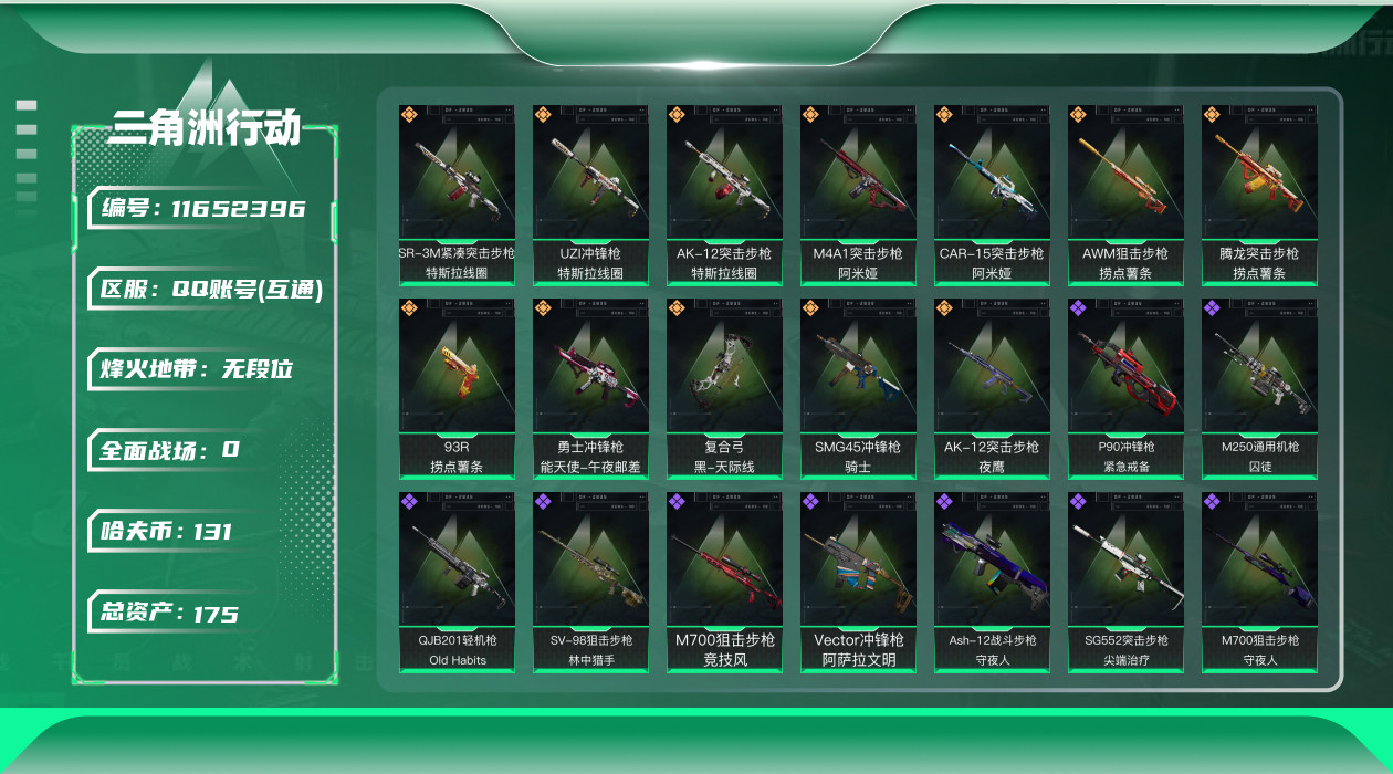 [11652396]总资产:175.2M 12传说枪械 哈夫币:131K 进阶安全箱(2×2)9.15号到期 可二次 可修改实名 烽火地带段位:无段位 全面战场段位:军士长 传说武器皮肤:SMG45冲锋枪-骑士,UZI冲锋枪-特斯拉线圈,AWM狙击步枪-捞点薯条,腾龙突击步枪-捞点薯条,93R-捞点薯条,AK-12突击步枪-特斯拉线圈,SR-3M紧凑突击步枪-特斯拉线圈,勇士冲锋枪-能天使-午夜邮差,复合弓-黑-天际线,M4A1突击步枪-阿米娅,CAR-15突击步枪-阿米娅,AK-12突击步枪-夜鹰 史诗武器皮肤:SG552突击步枪-尖端治疗,QJB201轻机枪-Old Habits,M1014霰弹枪-林中猎手,PKM通用机枪-守夜人,AS Val突击步枪-尖端治疗,M700狙击步枪-守夜人,Ash-12战斗步枪-守夜人,MP5冲锋枪-深海恐惧,勇士冲锋枪-深海恐惧,AKM突击步枪-林中猎手,.357左轮-幸运时刻,M250通用机枪-囚徒,SV-98狙击步枪-林中猎手,Vector冲锋枪-阿萨拉文明,M700狙击步枪-竞技风,M14射手步枪-黑鹰坠落,P90冲锋枪-紧急戒备