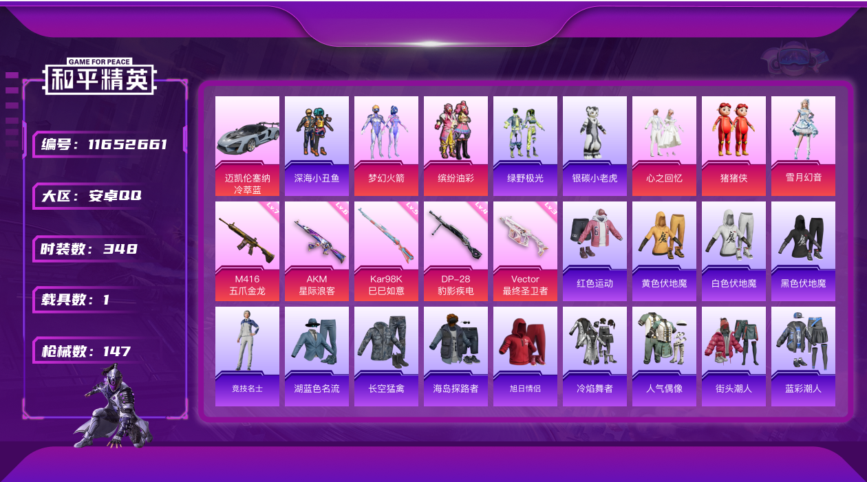 [11652661]5粉装 5特效枪 1载具 8印记 可二次 可修改实名 优质装备:迈凯伦塞纳(冷萃蓝),M416五爪金龙,梦幻火箭(新101)(新火箭少女101粉色套装),缤纷油彩(猪妹猪脸妹),AKM星际浪客,七级M416-五爪金龙,雪月幻音,Vector-最终圣卫者,Kar98K-巳巳如意 热门装扮:心之回忆,猪猪侠,深海小丑鱼,绿野极光,银碳小老虎 稀有枪皮:DP-28-豹影疾电 六级特效枪:六级AKM-星际浪客 五级特效枪:五级Kar98K-巳巳如意 四级特效枪:四级DP-28-豹影疾电 三级特效枪:三级Vector-最终圣卫者 紫色装扮:田园牧歌,轻风白浪,SS22特训,飞狐塔尔斯,SS23特训,幻彩翩翩,妙红点点,娇憨猪猪,夏雨游龙,萌趣咩咩,SS21特训,熠彩粉晶,SS31特训套装,人气偶像,冷焰舞者,霓虹热舞,旭日情侣,SS30特训套装,云朵鹅,雪绒豹,SS33特训套装,顶瓜瓜,飞驰魅影,音速流光,SS19特训,异彩先驱,SS18特训,长空猛禽,霓虹极客,缤纷果语,蓝彩潮人,街头潮人,超能勇士,黄色伏地魔,黑色伏地魔,龙的传人,龙魂突击队,柠萌假日,海岛探路者,夏日音浪,幻世战舞者,湖蓝色名流,绮丽涂鸦,疯狂小兔子,白色伏地魔,空投萌叽,糯粉咩咩,红色运动,炫蓝之夏,雏菊兔兔,萝兰蝴蝶,SS29特训,狂花道·娜可露露,星途旅人,纯真浪花,热情海星,异域银装,鱼渊荷华,燕燕于飞,巳巳如意,青团波波,糖糖葫芦,竞技名士,摩登魅猫,银尘,惊鸿侠骨,SS24特训(SS24特训套装),SS25特训,绝对偶像,锦衣飞扬,SS27特训,无暇誓言,小丑鱼,智谋强哥,大橘大利,蓝冰羽,紫幽梦,SS32特训服(SS32特训套装),糯粉咪咪(套装-糯粉咩咩),青玉碎影,绯格组合,萌黄之夏,白糯汤圆,蜜桃派对,恋语绒绒,光之冒险 优质战备:星梦奇缘降落伞,拳皇·狂花道降落伞,星途旅人降落伞,恐龙拽拽降落伞,千金淑猫降落伞,幻彩电音降落伞,智耀战神降落伞,樱桃泡泡降落伞,月下星之子降落伞,纯梦嫁纱降落伞,梦幻火箭降落伞,梦幻火箭飞行器,流星咚咚降落伞