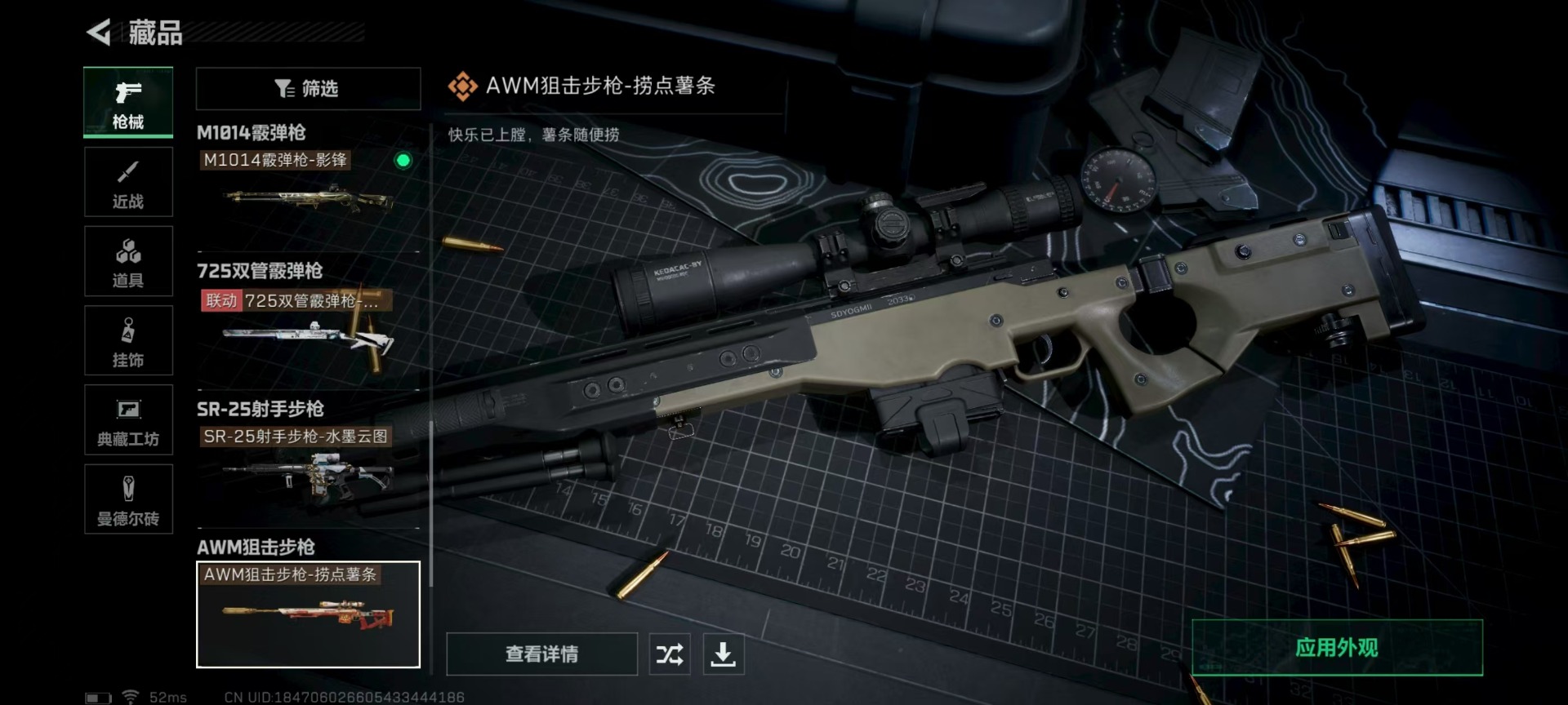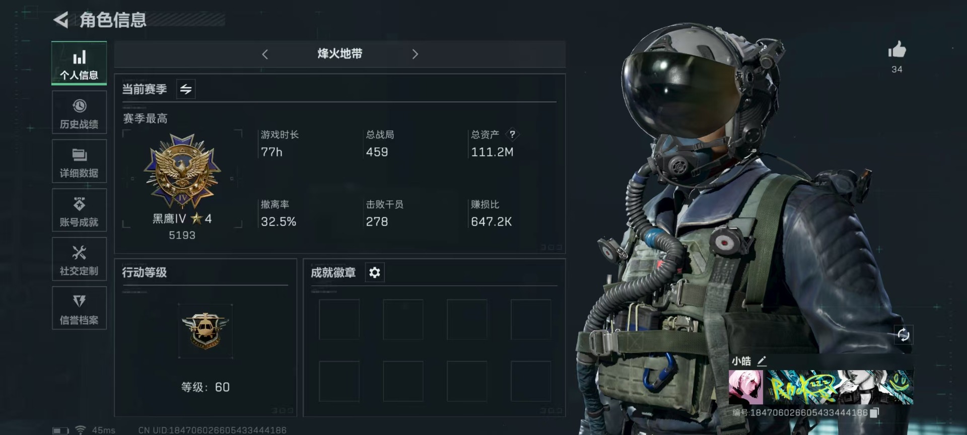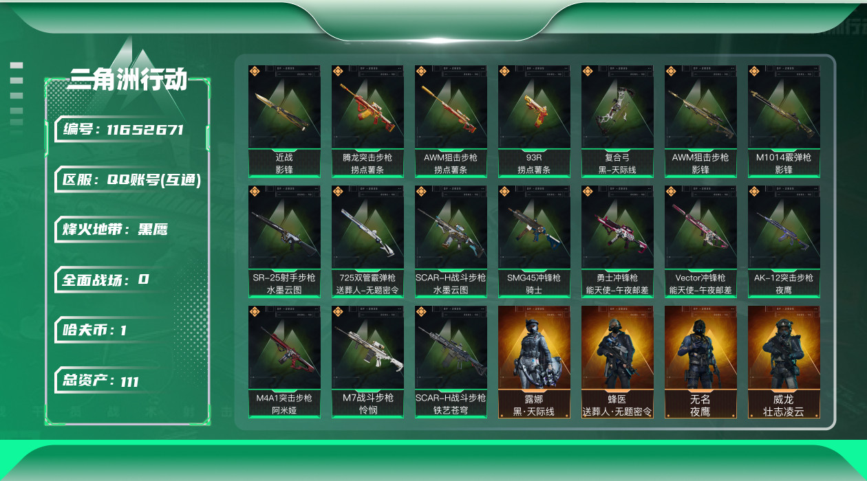 [11652671]总资产:111.2M 4干员外观 1近战传说 17传说枪械 哈夫币:1.177K 高级安全箱(2×3)9.15号到期 可二次 可修改实名 优质装备:近战-影锋 烽火地带段位:黑鹰 全面战场段位:军士长 传说武器皮肤:SR-25射手步枪-水墨云图,SCAR-H战斗步枪-水墨云图,M1014霰弹枪-影锋,AWM狙击步枪-影锋,SCAR-H战斗步枪-铁艺苍穹,SMG45冲锋枪-骑士,AWM狙击步枪-捞点薯条,腾龙突击步枪-捞点薯条,93R-捞点薯条,勇士冲锋枪-能天使-午夜邮差,Vector冲锋枪-能天使-午夜邮差,复合弓-黑-天际线,725双管霰弹枪-送葬人-无题密令,M4A1突击步枪-阿米娅,AK-12突击步枪-夜鹰,M7战斗步枪-怜悯 干员外观:威龙-壮志凌云,无名-夜鹰,蜂医-送葬人·无题密令(S5),露娜-黑·天际线
